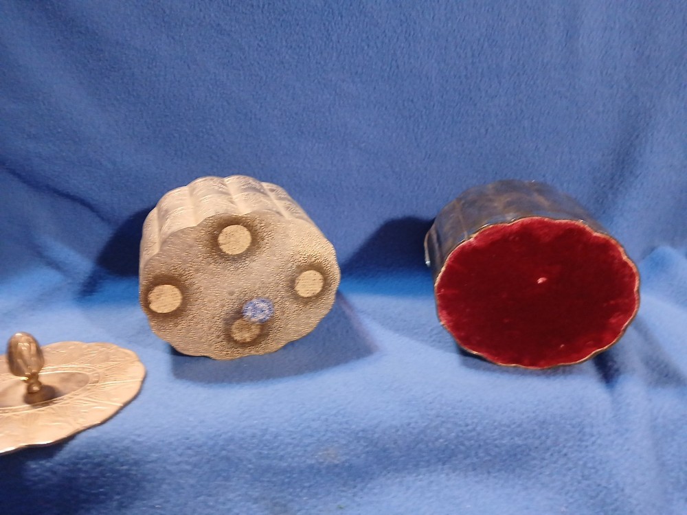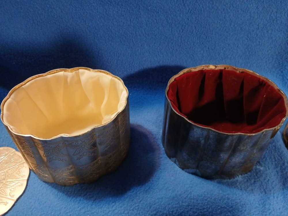 This set of 2 International Silver Company trinket boxes features an oval shape with a red and white silk and velvet lining. The silver plated boxes are adorned with an engraved design and have a lid for secure closure. Perfect for all occasions, these medium-sized jewelry boxes are a part of the Keepsake Boxes collection, adding elegant decor to any room in your home. Ideal for storing small treasures or jewelry, these ornate boxes exude a touch of vintage charm from the late 20th century.