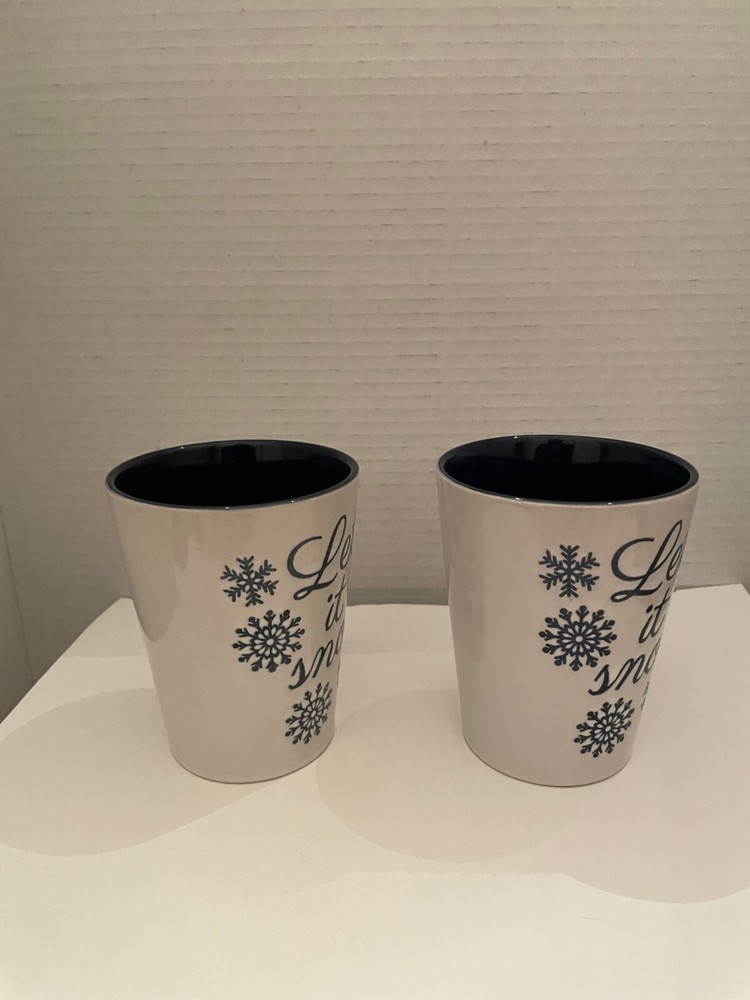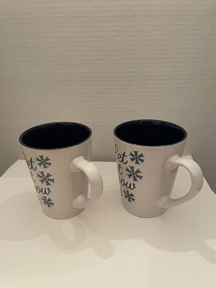 Set of 2 California Pantry 'Let It Snow' Holiday Season Mugs. Color: White with Navy Letters and Snowflakes. Condition: Used. Very Good Condition. Like new. Zoom in on photos. Great for coffee, tea or hot chocolate bar. Great for the collector in your family. Buyer pays shipping. I SHIP FAST Weight: l lb. 8 oz. Packing will increase overall weight. Buyer location determines final shipping costs. Height: 4 1/4" Care: Dishwasher Safe Microwave Safe Made in China Zoom in on pictures. Please message questions or concerns. Working to earn your Positive Feedback with Value, Variety and Service. Thank you for your consideration. Have a great day.
