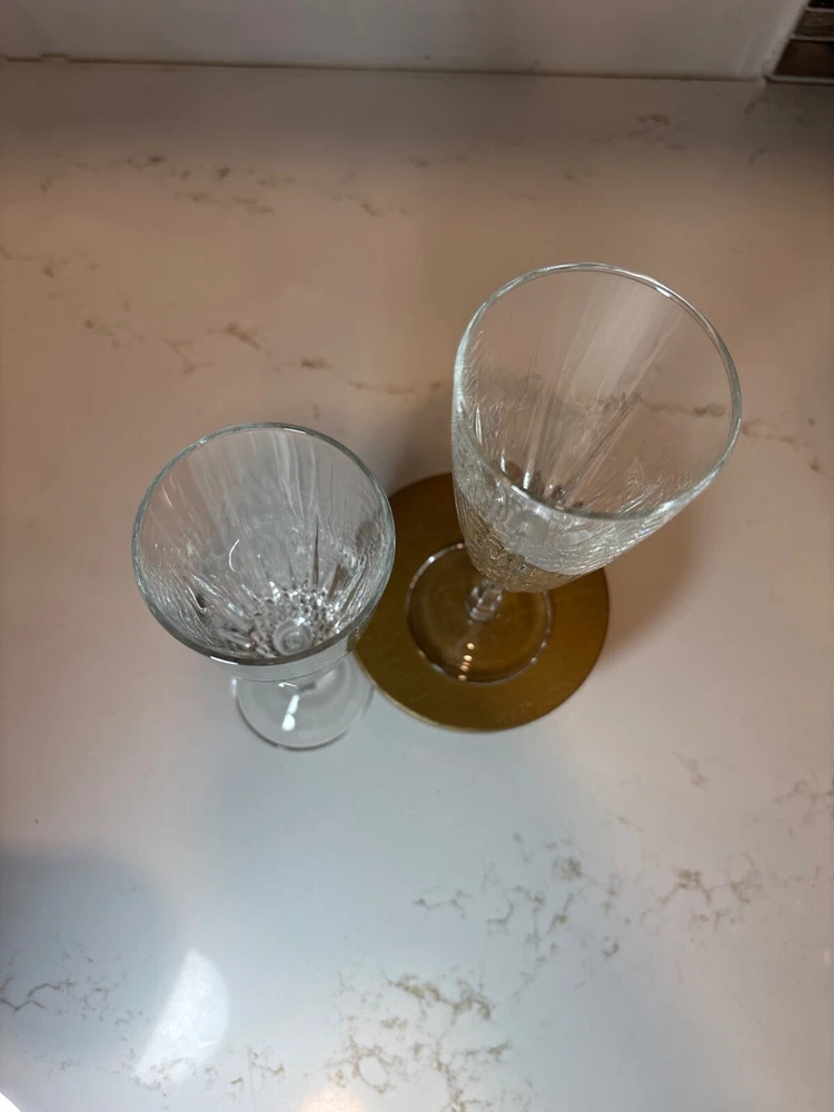 Elevate your toasting experience with this set of 2 Long Champ Champagne Flutes. Crafted from premium crystal, these glasses offer a clear, refined view of your bubbly, ensuring every sip is as delightful to the eyes as it is to your taste buds. The Mid-Century Modern design exudes a timeless elegance, making these flutes a sophisticated addition to any occasion. The cut glass production style not only showcases the drink's effervescence but also enhances the visual appeal of your table setting. Whether it's a celebration or an elegant dinner, these unbranded champagne glasses are designed to impress while providing a classic touch to your dining experience.