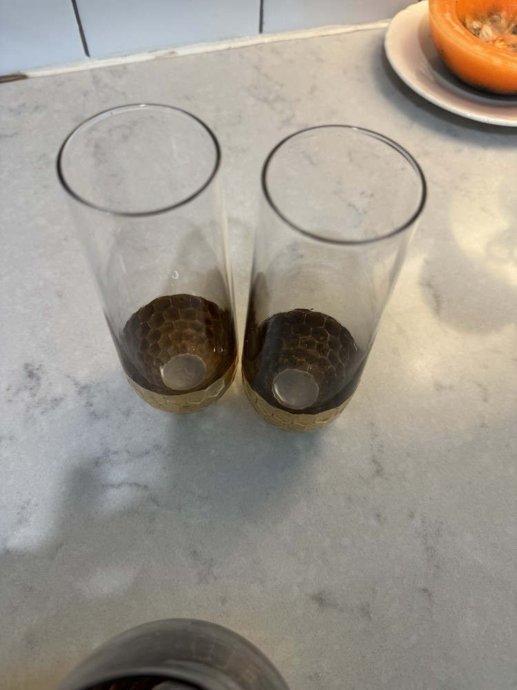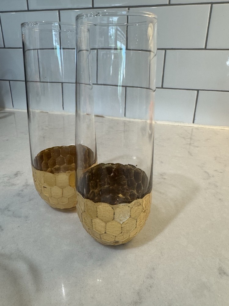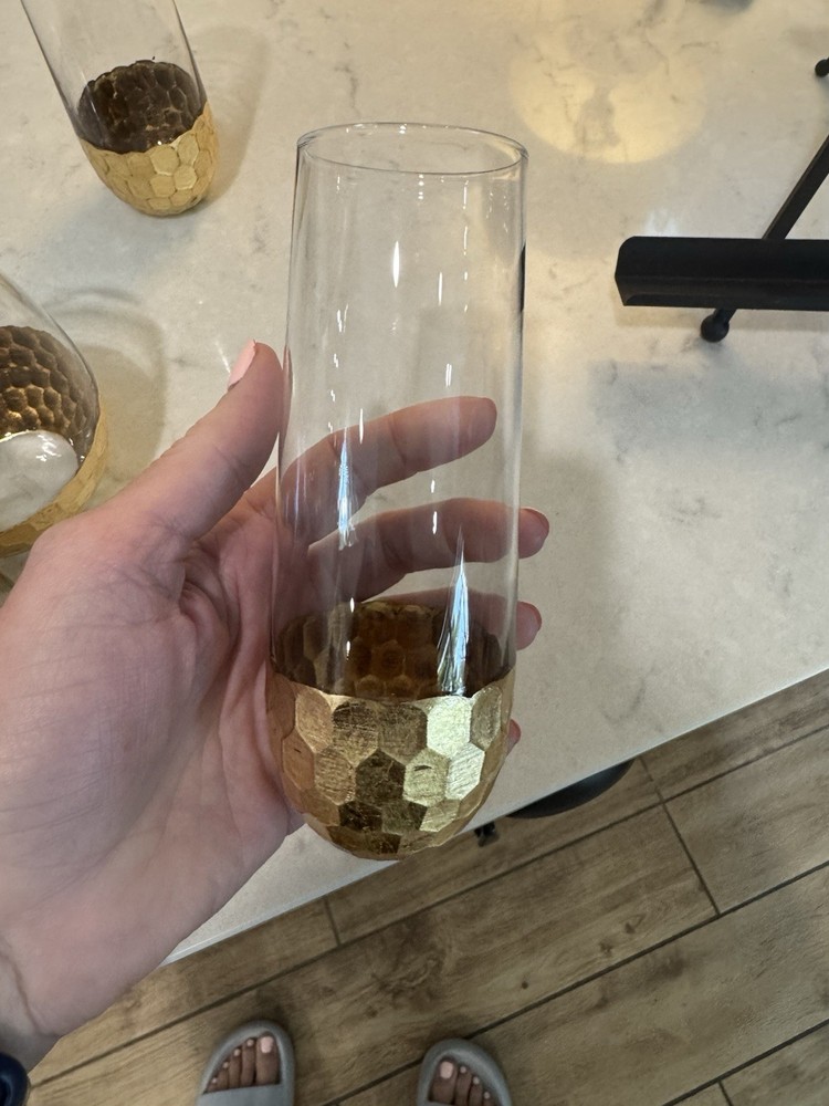 Elevate your toasting experience with this set of two modern stemless champagne glasses. Each glass is meticulously crafted from premium glass material, complemented by a distinctive hammered gold metal bottom that adds a touch of sophistication to your beverage presentation. The sleek round design and lustrous gold color make these glasses a versatile addition to any occasion, whether a celebratory brunch or an elegant evening gathering. The glasses stand at a convenient height of 4.7 inches with a width of 3.5 inches, ensuring a comfortable grip and an impressive visual appeal. The sturdy 2-pound weight of the set confirms their quality and durability. Designed with a two-piece set includes stemless glasses, they are ready to serve and enjoy your favorite sparkling wines without compromising on style or functionality.