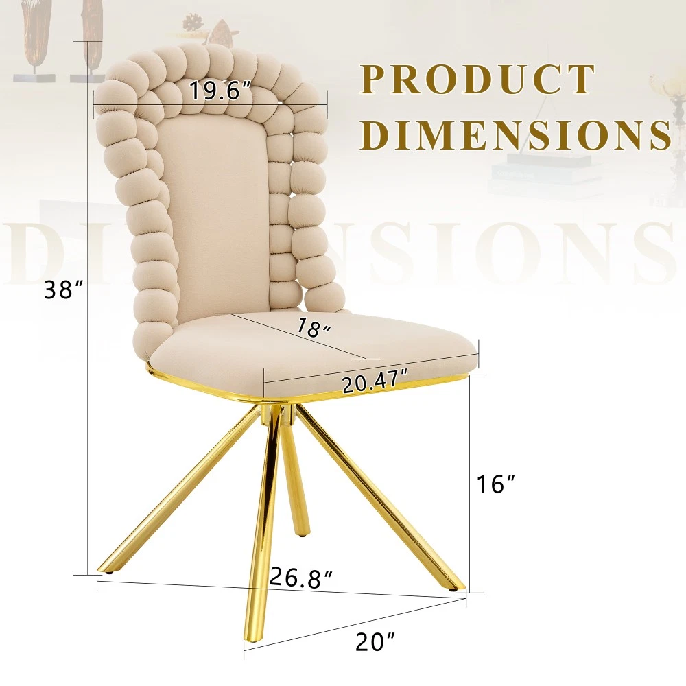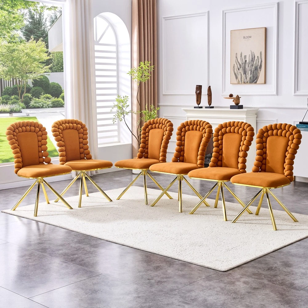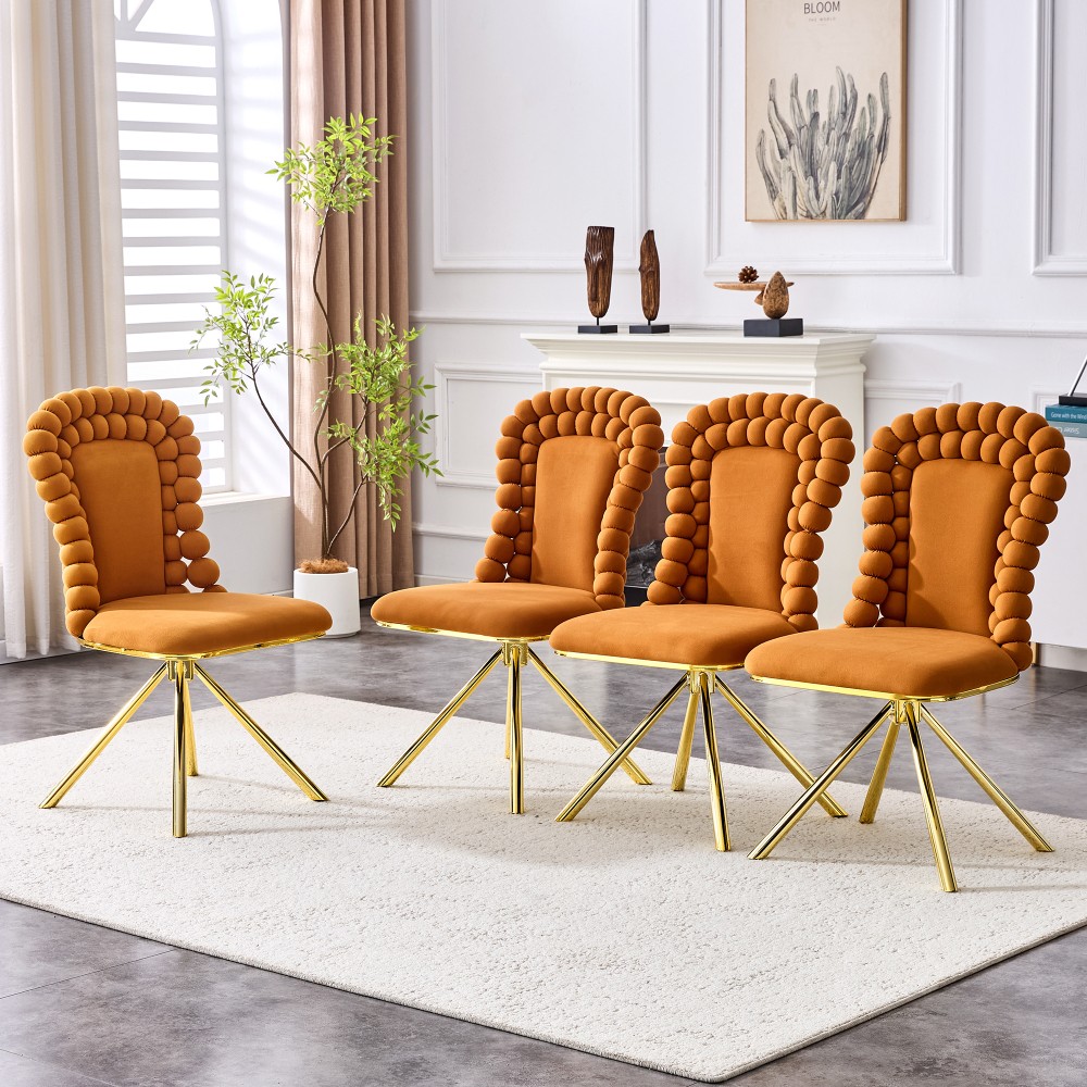 Set of 2 Orange Velvet Bubble Dining Chairs, Gold Metal Legs - Modern Upholstered Accent Chairs for Dining Room & Kitchen Elevate your dining space with this stunning set of 2 orange velvet bubble chairs! Blending artistic flair with luxurious comfort, these chairs feature a one-of-a-kind ball-chain bubble backrest, premium Dutch velvet upholstery, and sleek gold metal legs. More than just seating, they’re a striking statement piece that infuses your dining room, kitchen, or any living area with modern sculptural charm and vibrant personality—perfect for upgrading your home decor with style and functionality. Unique Ball-Chain Bubble Design & Artistic Appeal : Inspired by jewelry and modern art, each chair boasts a creative ball-link backrest crafted from plush round cushions, resembling a chain of delicate bubbles. This distinctive spherical tuft silhouette brings sculptural elegance to any interior, turning the chairs into an instant conversation starter. The intricate back structure not only catches the eye but also enhances the overall aesthetic, making them a focal point in both formal dining spaces and cozy kitchen nooks. Premium Non-Directional Dutch Velvet Upholstery : Upholstered in high-quality Dutch velvet, these chairs offer a superior texture that outshines ordinary velvets. The non-directional fabric has no shading effect or “nap,” ensuring a smooth, even appearance from every angle. Soft and plush to the touch, the velvet upholstery provides a luxurious seating experience, while the vibrant orange hue adds a pop of color that effortlessly brightens up any space. Luxurious Gold Metal Legs & Exquisite Craftsmanship : Supported by sturdy electroplated gold metal legs, the chairs exude chic contemporary glamour. The polished gold finish pairs beautifully with the orange velvet, striking a perfect balance between luxury and modern minimalism. Meticulously crafted with attention to every detail, from the spherical tufts to the smooth leg surfaces, these chairs showcase exceptional craftsmanship and a sophisticated aesthetic that elevates any decor. Ergonomic Design for All-Day Comfort : Designed with comfort at its core, the gently curved bubble backrest hugs your body to provide optimal lumbar support. The seat is thickly padded with high-density foam, ensuring superior comfort during long meals, gatherings, or casual relaxation. Whether you’re enjoying a family dinner or working at the kitchen counter, these chairs keep you cozy and supported throughout the day. Versatile 2-Piece Set for Easy Decor Upgrade : Each package includes 2 dining chairs, offering a convenient solution to instantly refresh your dining area’s ambiance. Their versatile design makes them easy to integrate into existing decor, complementing both modern and eclectic styles. Beyond the dining room and kitchen, they also work beautifully as accent chairs in living rooms or home offices, adding a touch of luxury wherever they’re placed. Detailed Product Specifications : - Color: Orange (Velvet) + Gold (Metal Legs); - Material: Metal + Premium Dutch Velvet + High-Density Foam (Filling); - Quantity: Set of 2; - Overall Assembled Dimensions: 20.50"L × 18.00"W × 38.00"H; - Product Weight (2 Chairs Total): 45.00 LBS; - Package Dimensions: 27.95"L × 22.05"W × 21.65"H; - Package Weight: 54.60 LBS; - Key Features: Unique Ball-Chain Bubble Backrest, Non-Directional Dutch Velvet, Electroplated Gold Metal Legs, Ergonomic Curved Back, Thick Foam Padded Seat, Artistic Statement Piece; - Suitable For: Dining Room, Kitchen, Living Room, Home Office (as Accent/Dining Chairs). Important Notes : - Manual measurement may result in minor reasonable deviations; please refer to the actual product for precise details. - The actual color may vary slightly from the images due to factors such as lighting conditions, screen settings, and resolution differences. - To preserve the velvet upholstery and gold finish, clean the chair surface with a soft brush or damp cloth; avoid using harsh chemicals or abrasive cleaners that may cause damage. - Assembly is required; detailed instructions and all necessary hardware are included for hassle-free setup. Worry-Free Purchase Guarantee : We stand behind the quality of this set of 2 orange velvet bubble dining chairs with a 1-Year Warranty. If you’re not completely satisfied with your purchase for any reason, we offer a 30-Day Free Return & Exchange Policy. Shop with confidence, knowing you’re getting a stylish, durable, and comfortable seating solution that elevates your home decor!