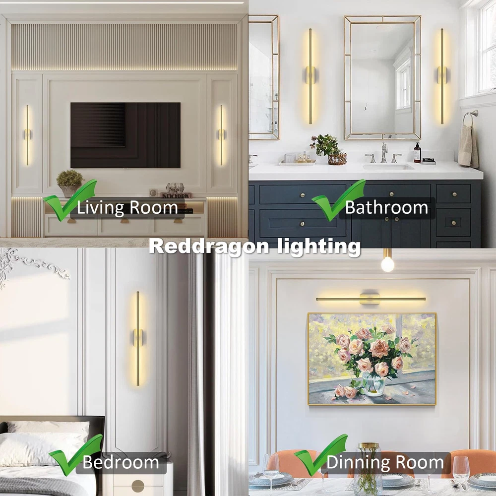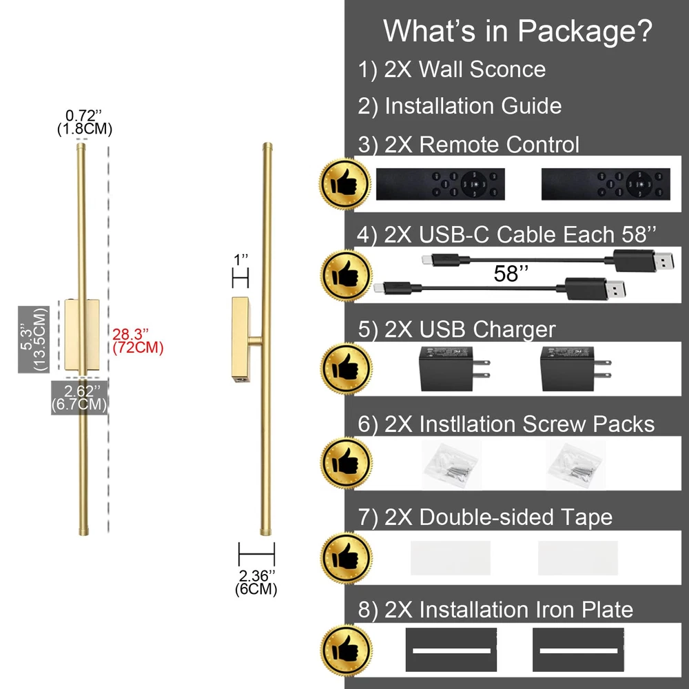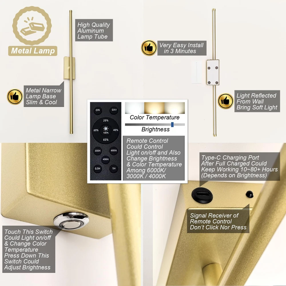 【Excellent Design】This set of 2 rechargeable wireless wall sconces use narrow base design which make the whole lamp looks slim and elegant. They are made of strong metal and dimmable. You could use remote control or touch switch to control light on/off, change brightness and color temperature among cold white/warm white/neutral white. 【Don’t Need Electrician and Super Easy to Install】These gold cordless wall sconces are battery operated so they don't need wiring. Installation iron plate was included you could fix it to wall by either double-sided tape or screws. As lamp back has magnetics so you just put lamp onto iron plate (magnetic connection). Done. Later it's also very easy for you to pull out the lamp from iron plate. The installation way by double-sided tape is suitable for almost every installation surface like painted wall, ceramic tile wall, wood surface, wall covering, glass surface, mirror etc. 【Super Easy to Charge】Each package includes 2 pieces of long (58’’) USB-C charge cables AND 2 pieces of charger plugs so it’s super easy to charge if you have outlet nearby. You could also pull wall sconce out from iron plate to charge. 【Long Endurance】Each battery operated wall sconce has big capacity battery inside. After full charged, lamp could keep working for 10~80+ hours (depends on brightness). Press down the touch switch on lamp could get lowest brightness. 【Various Applications】These modern and minimalist cordless wall sconces are ideal for living room, bedroom, corridors, entryway, bathroom, dining room, etc.