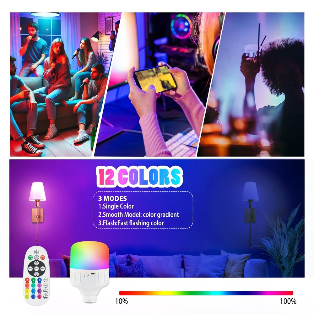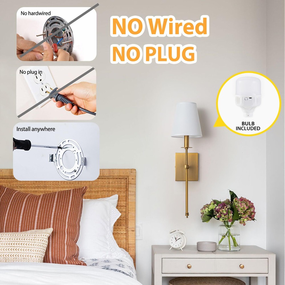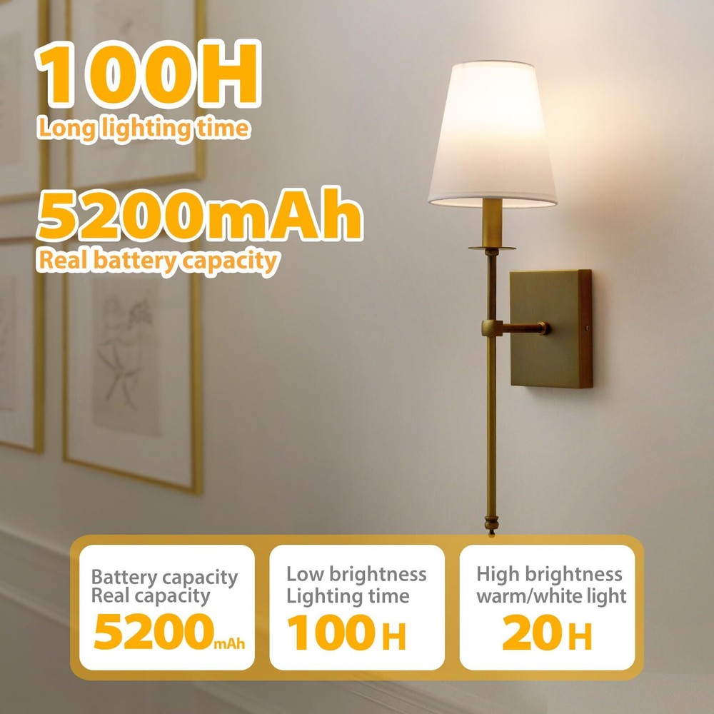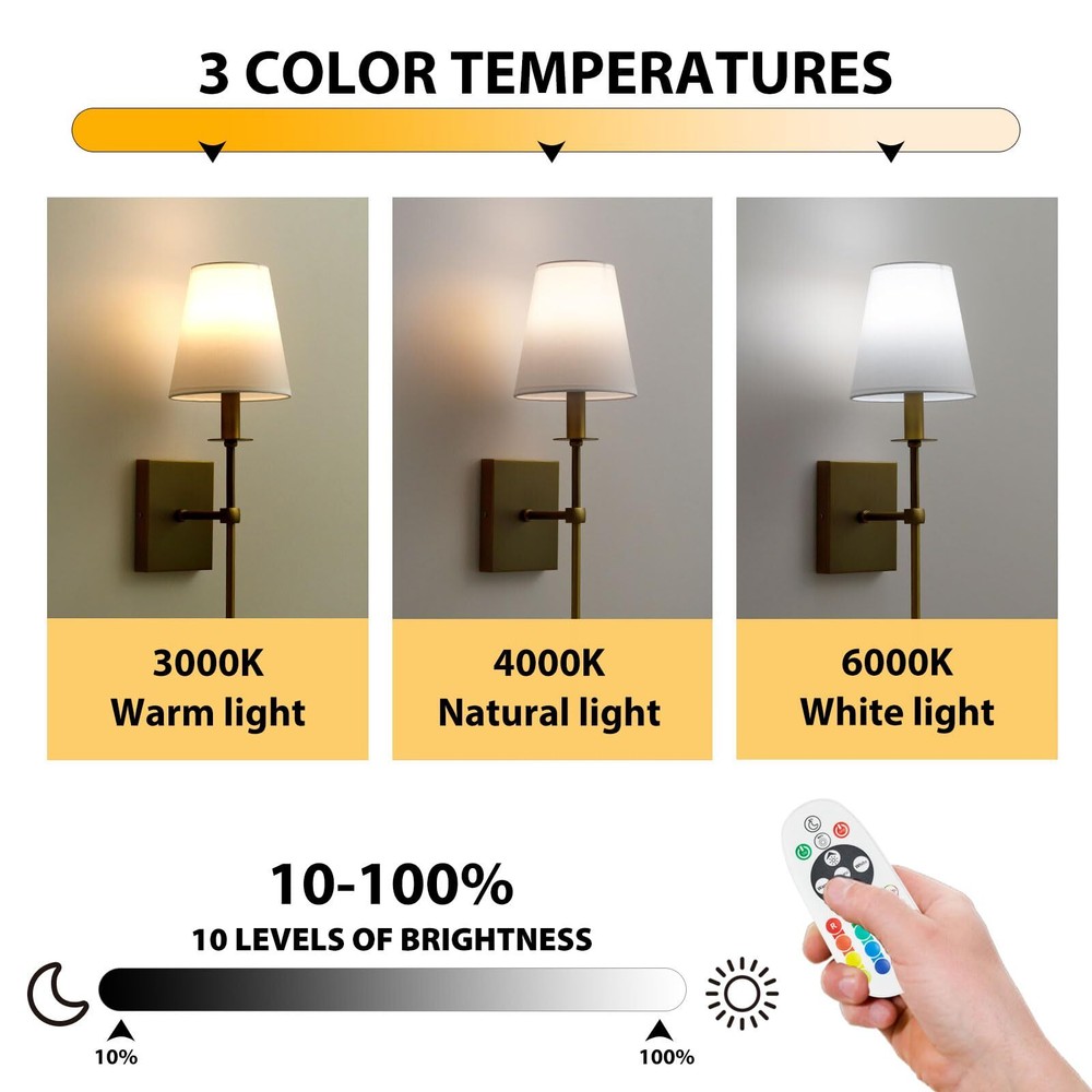 Battery Operated& Easy Installation: These wall sconces are battery-powered and require no wiring, making them perfect for any room. Install the wireless wall lights effortlessly without an electrician, enhancing your bedroom, living room, or hallway decor.Ideal for renters and DIY decorators! Rechargeable Bulbs with Extended Runtime: Each sconce features a rechargeable LED bulb with a robust 5200mAh capacity. Experience up to 24 hours of continuous lighting on the brightest setting or an impressive 100 hours on the dimmest. With 10 adjustable brightness levels (10%-100%), you can easily create the perfect ambiance for reading, entertaining, or unwinding. Vibrant Lighting with 12 RGB Colors & 3 Modes: Transform your space with 12 dynamic RGB colors and three light modes—3000K warm, 4000K natural, and 6000K cool white. Whether you're hosting a festive gathering or enjoying a quiet evening, these sconces wall lighting adapt to your mood and setting, making them a versatile addition to any room. These wall lights are perfect for setting the ambiance Remote Control & Auto-Off Timer: Adjust brightness, switch colors, or set the perfect lighting mode effortlessly with the included remote control. For added convenience, use the timer function to automatically turn off the lights after 30 or 60 minutes—perfect for bedtime routines, nighttime nursing, or energy savings Stylish & Versatile Design for Any Decor: Crafted with premium materials, these sleek battery sconces complement a variety of interior styles—from modern to rustic. This sconces wall decor set of 2 features a cordless, battery-operated design, making them perfect for bedrooms, living rooms, reading nooks, or as ambient night lights. Enhance your home's aesthetic while enjoying the freedom to place them wherever you desire