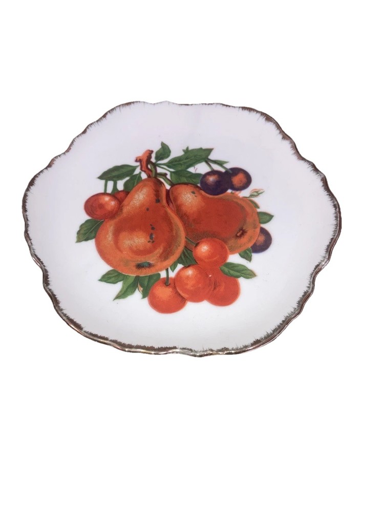 This product is a set of two vintage fruit decorative hanging plates with a scalloped rim and gold trim. These collector plates are perfect for adding a touch of elegance and charm to any home decor. The plates feature a classic design with a golden color that complements various styles of decor. Ideal for collectors or for adding a decorative accent to a room, these plates are sure to be a unique and stylish addition to your collection.