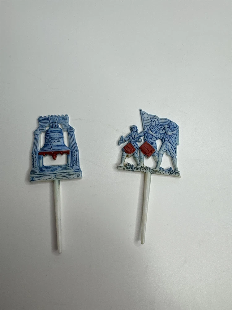 Set of 2 Vintage Liberty Bell and Military Men /w Flag Picks Made in Hong Kong Item is in vintage pre-owned condition and may show some signs of use and wear/tear. Please check out the pictures and let me know if you have any questions. Thank you for checking out my shop! :) Our hand-selected products are carefully examined, photographed, and stored in a smoke-free environment. Orders received by 2pm ET generally ship the next business day from Pennsylvania via USPS. I'm happy to combine shipping on orders; eBay should provide a combined shipping quote in many cases. I can always combine shipping manually as well if that is helpful.