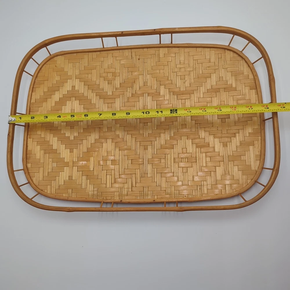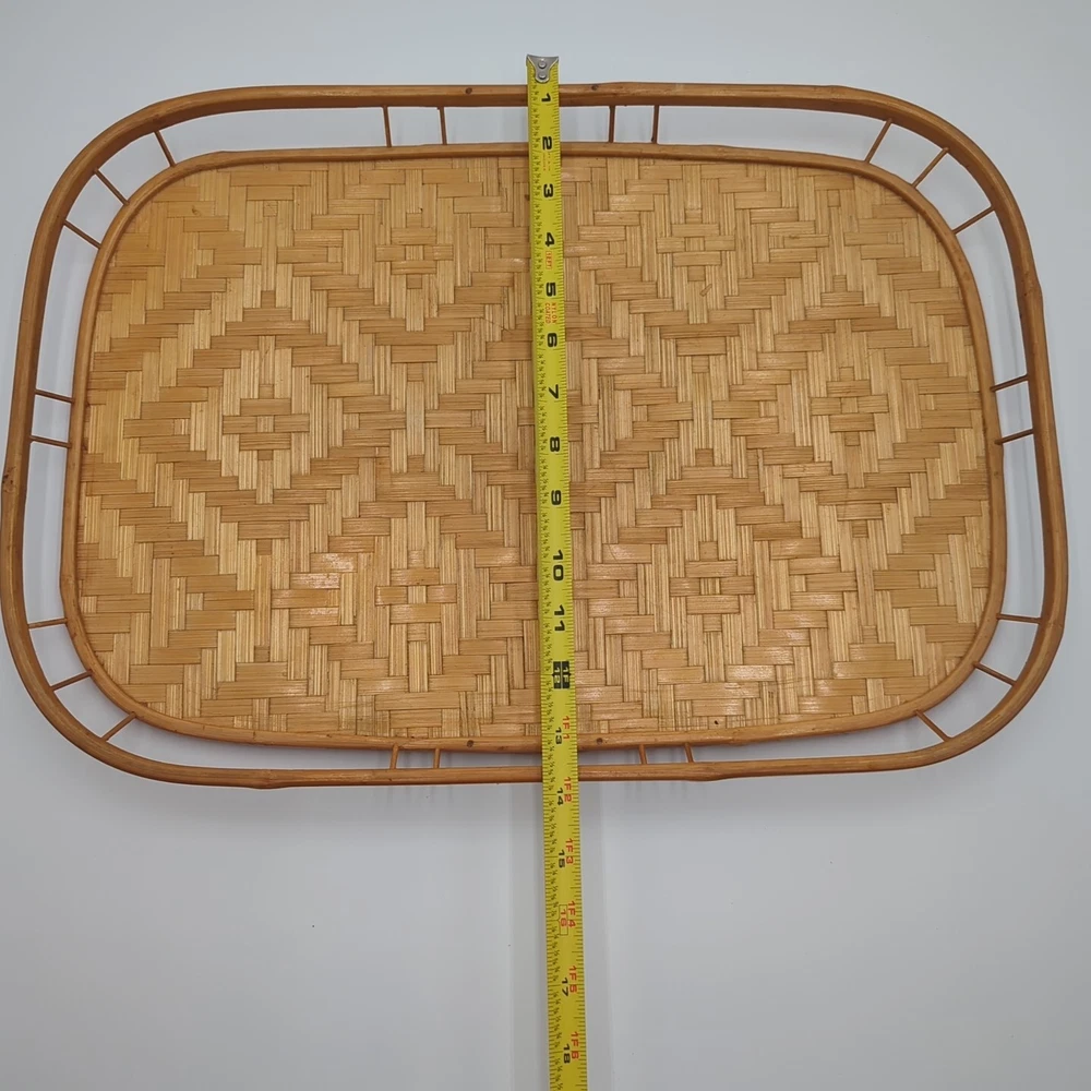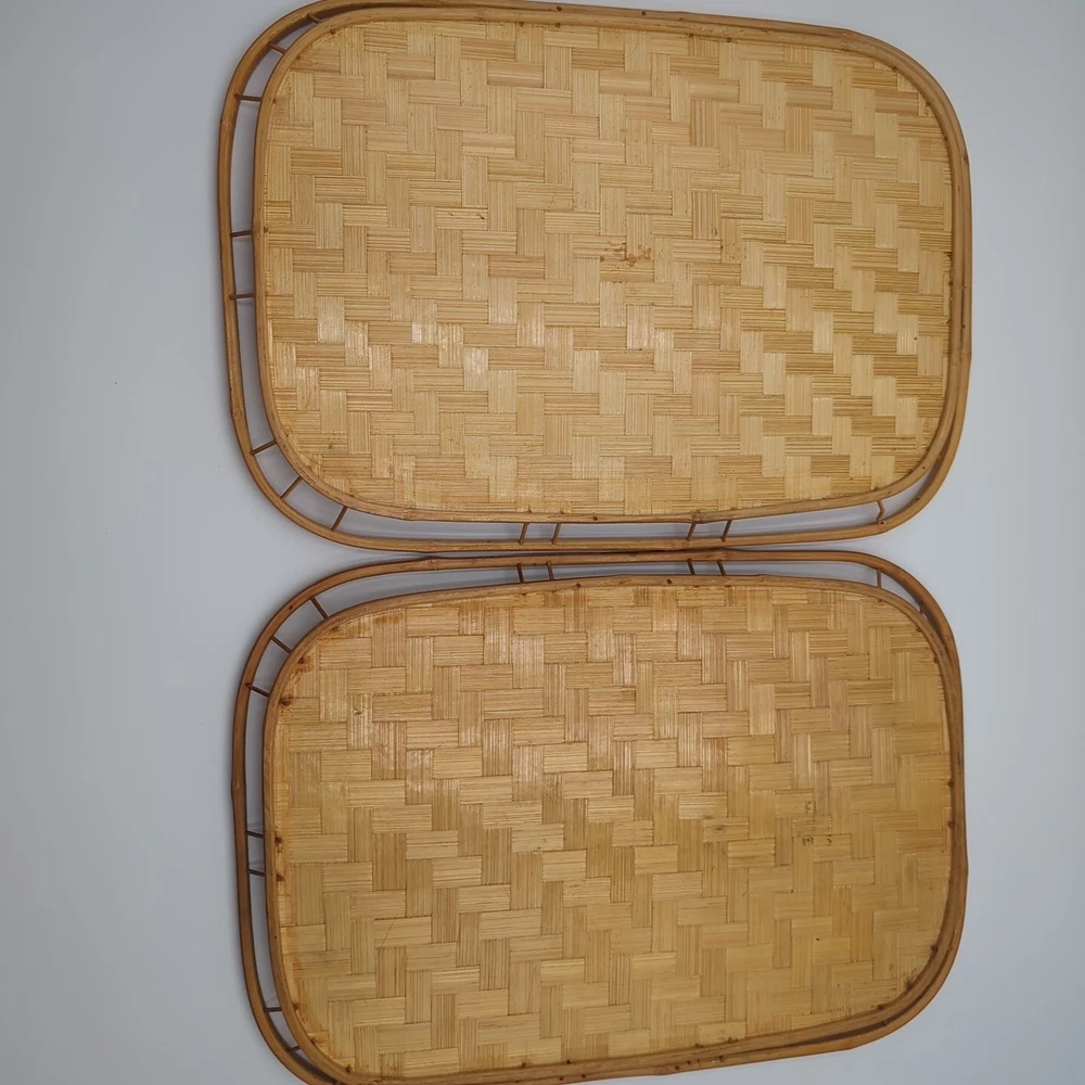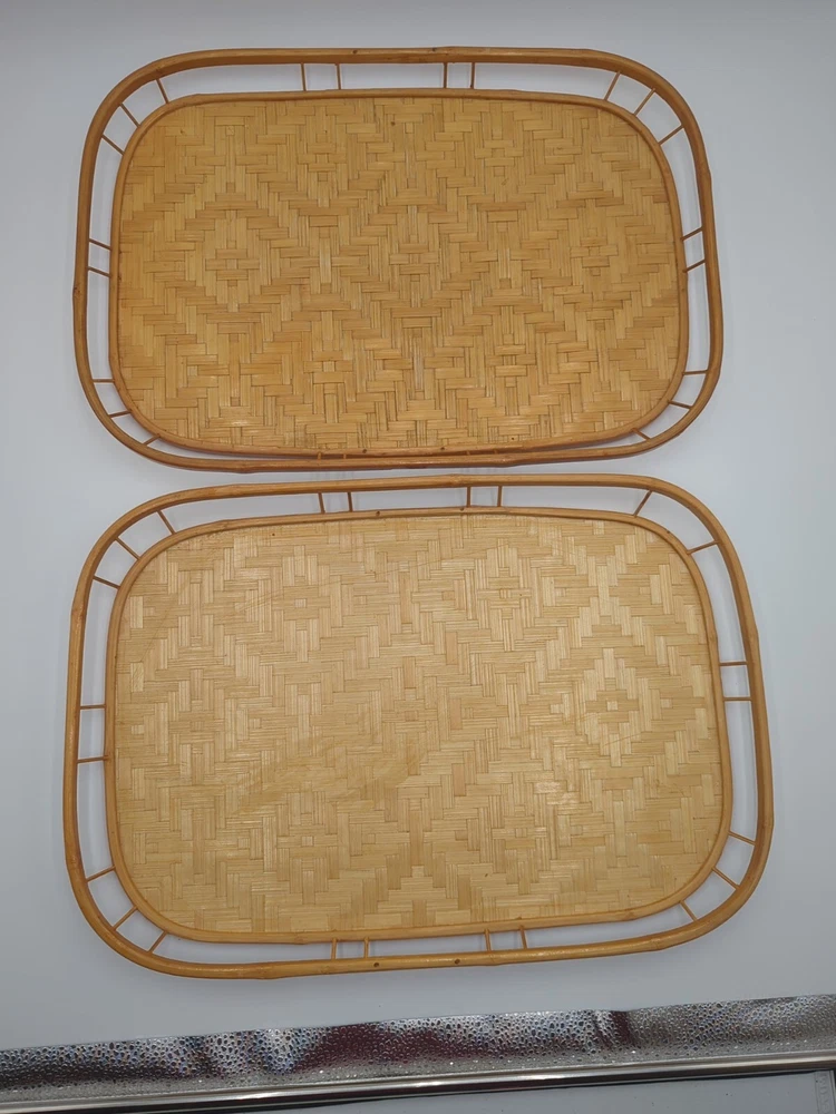 Color: Natural UPC: Does not apply Material: Bamboo, Rattan, Wicker Number of Items in Set: 2 Manufacturer Warranty: None Finish: Bamboo Brand: Unbranded Country/Region of Manufacture: Unknown Style: Boho Size: Large Number of Compartments: 1 Shape: Rectangle Item Width: 13 in Theme: Boho Type: Serving Tray Manufacturer Color: Natural Pattern: Woven Features: Tray Occasion: All Occasions Seller Notes: “Very good condition.” gtin13: Does not apply Item Length: 19 in
