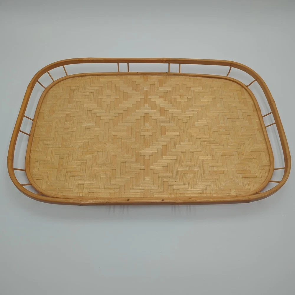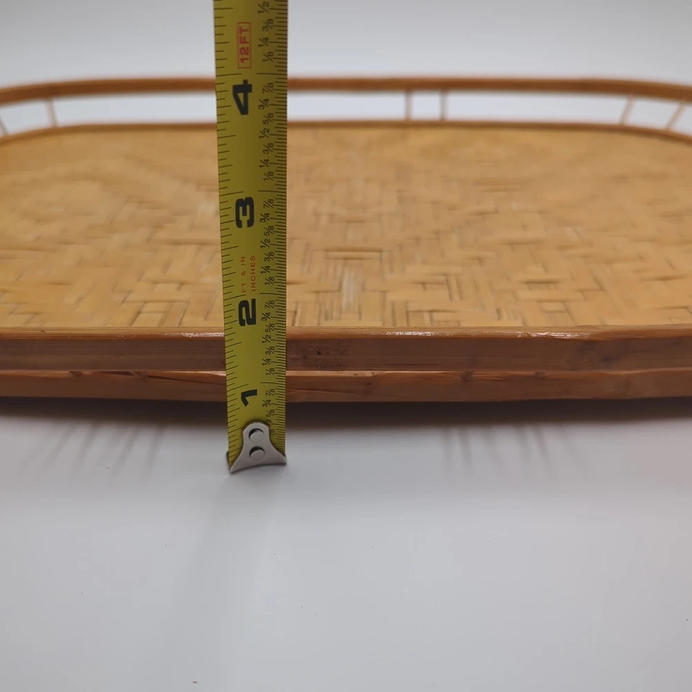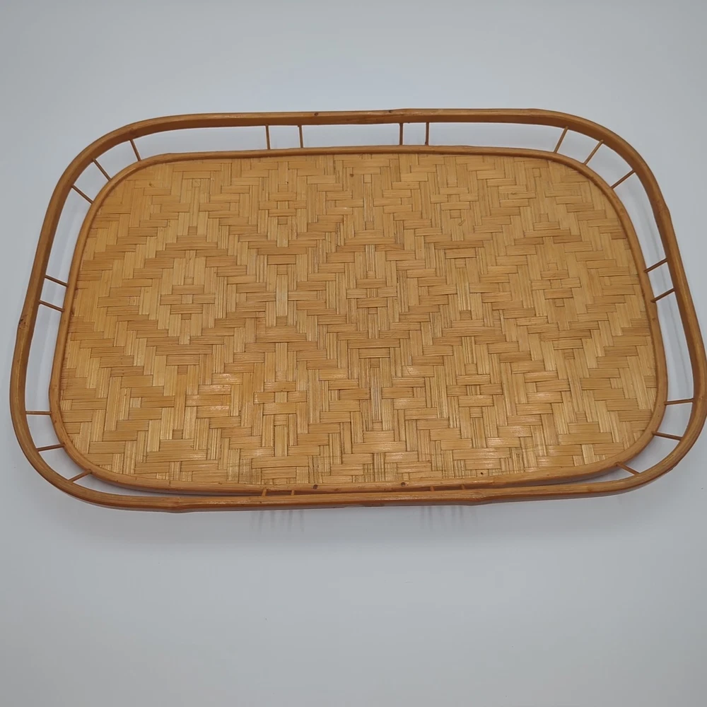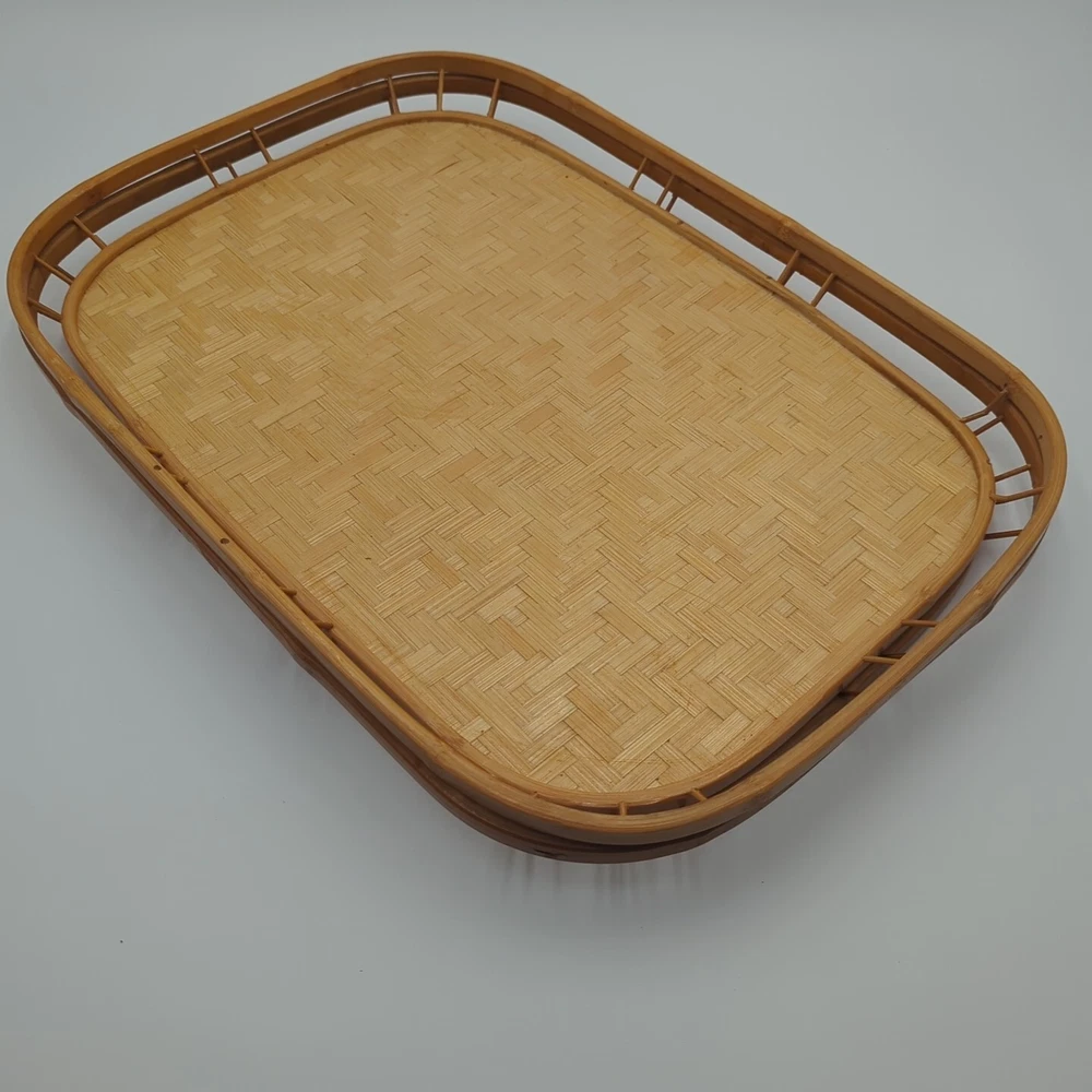 Color: Natural UPC: Does not apply Material: Bamboo, Rattan, Wicker Number of Items in Set: 2 Manufacturer Warranty: None Finish: Bamboo Brand: Unbranded Country/Region of Manufacture: Unknown Style: Boho Size: Large Number of Compartments: 1 Shape: Rectangle Item Width: 13 in Theme: Boho Type: Serving Tray Manufacturer Color: Natural Pattern: Woven Features: Tray Occasion: All Occasions Seller Notes: “Very good condition.” gtin13: Does not apply Item Length: 19 in