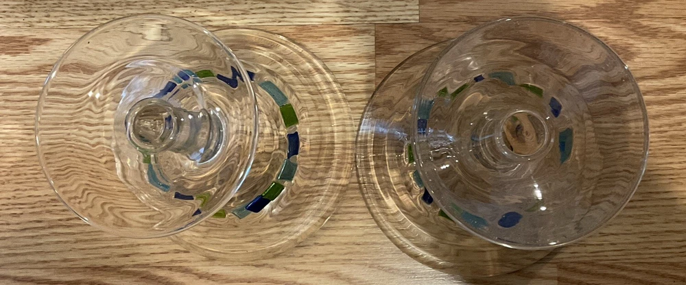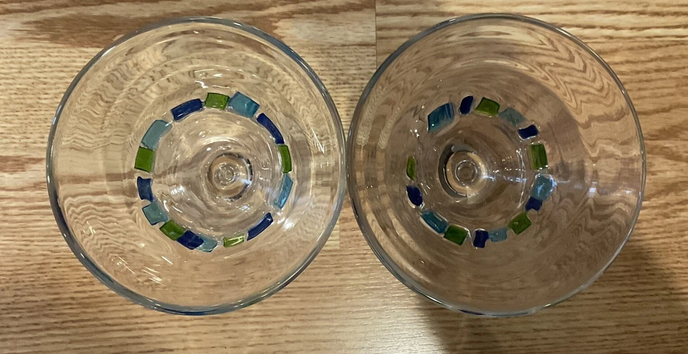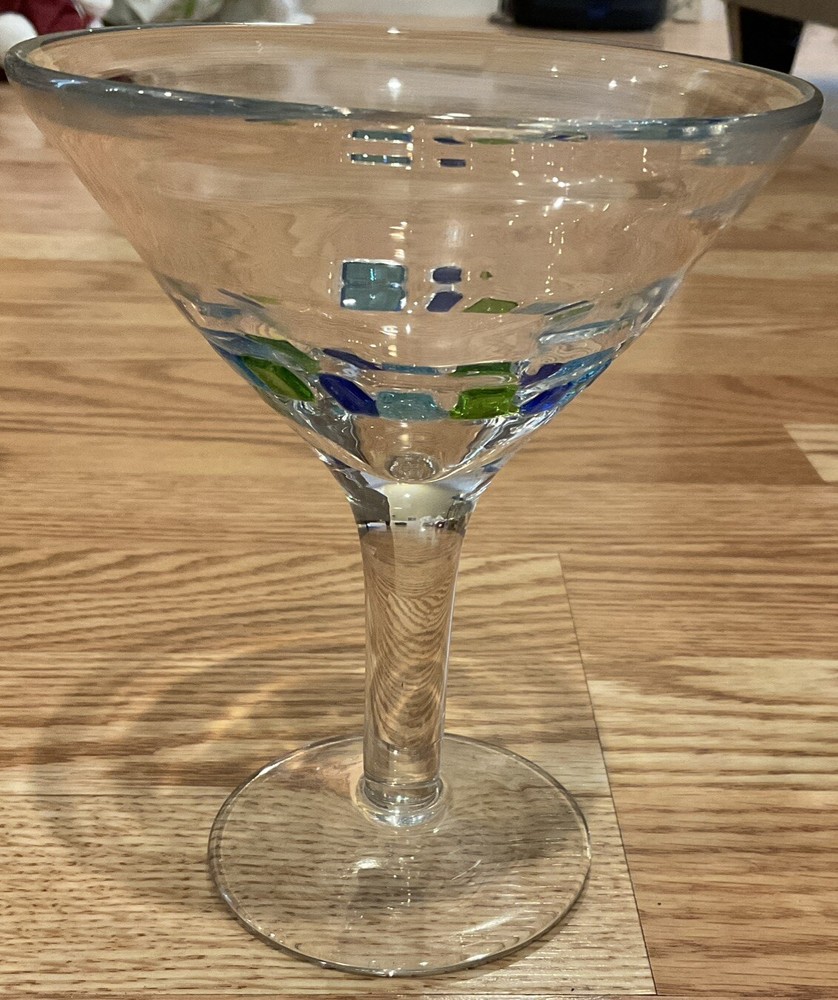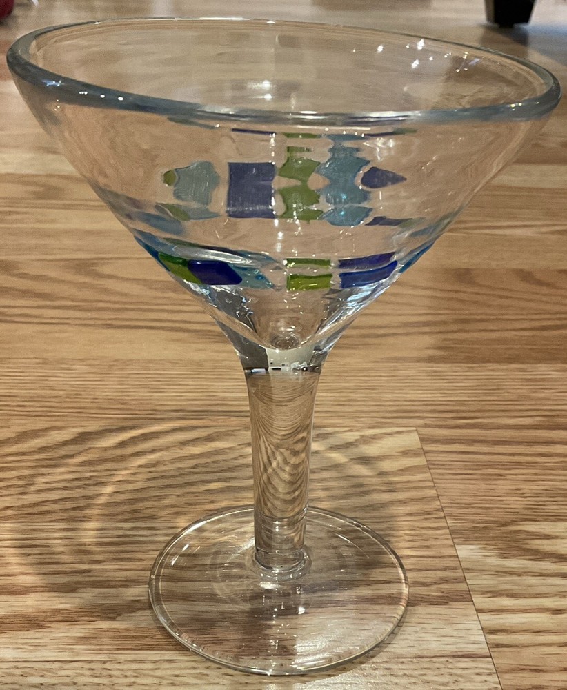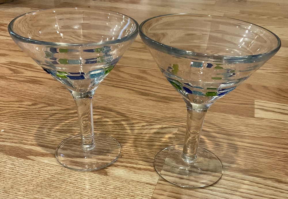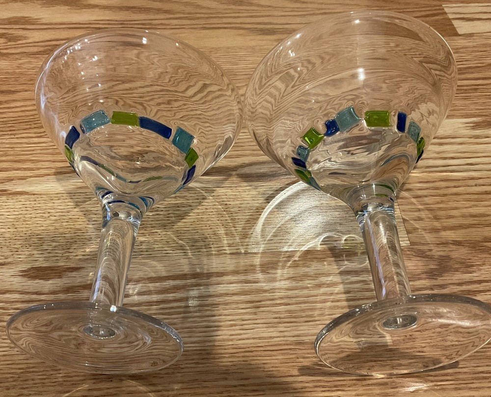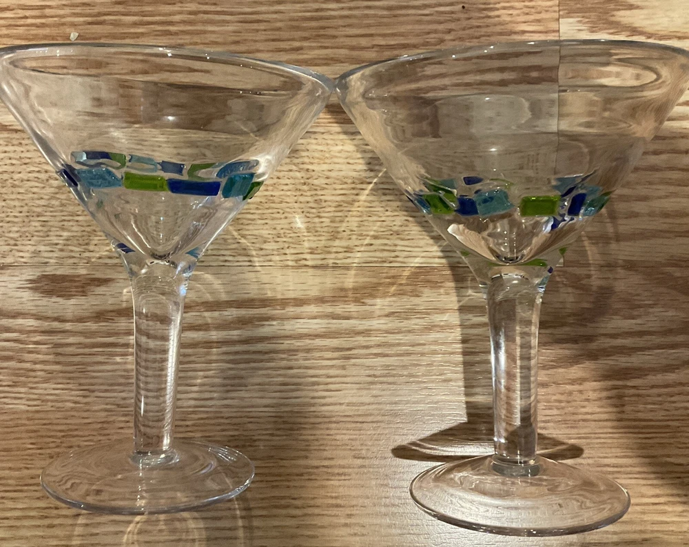 Elevate your home bar with this set of 2 fused mosaic martini or daiquiri glasses. The stunning blue and green design is perfect for all occasions and will impress your guests. Crafted from hand blown glass, these glasses are durable and perfect for regular use. The glasses are designed to hold your favorite cocktail and provide a comfortable grip, making them ideal for any bar or kitchen. Add a touch of elegance to your drinkware collection with these gorgeous glasses. They are NEW, no imperfections. Six inches high and 5 inches in width. Very heavy and sturdy… unique! Pictures do not do them justice!