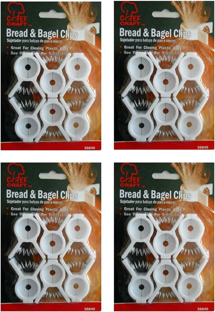 24-clips (4 Packs of 6) Seal your bread, rolls, buns bagels, frozen foods, popcorn, jelly beans, corn chips, potato chips, crisps, pretzels, candy bags, biscuits, crackers and more with these clips Keeps food fresh longer and seals tighter. This food saver replaces hard to use twist ties, bread bag sealers, and rubber bands Great for closing gourmet baked goods. Excellent for use in kitchen, barbecue, picnics, tailgate parties and as a gift idea Faster, smaller and easier to use then store than other clips. Multiple purpose and reusable for thousands of uses Set of 24 Bread and Bagel Bag Clips