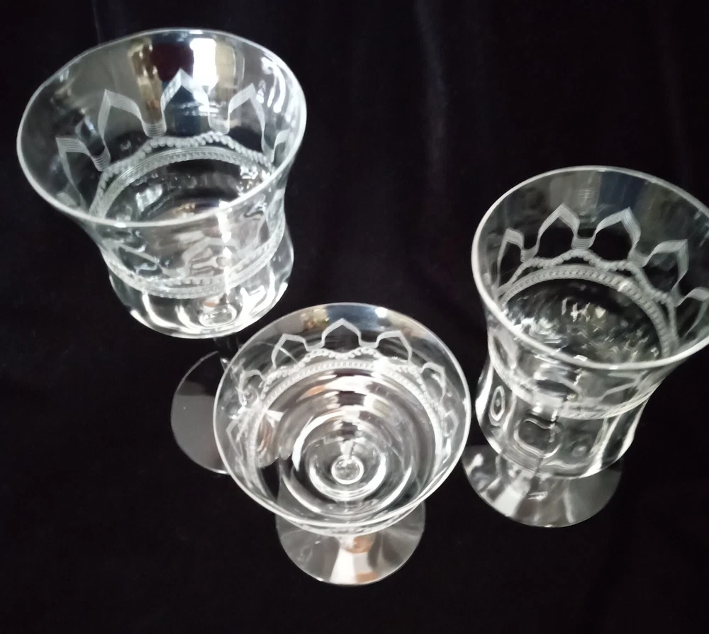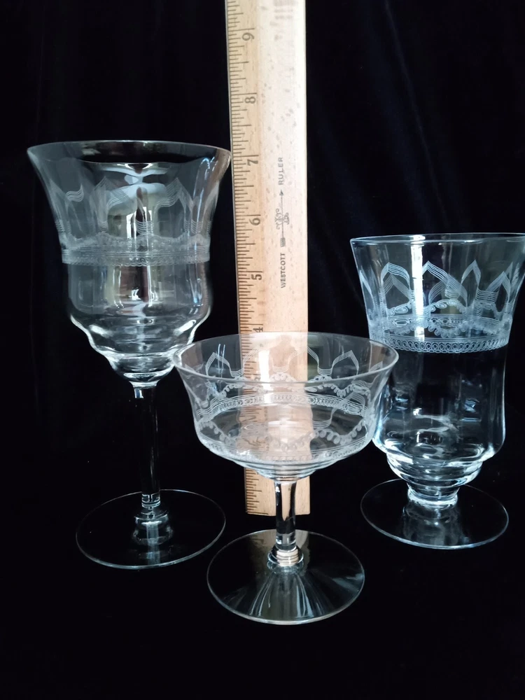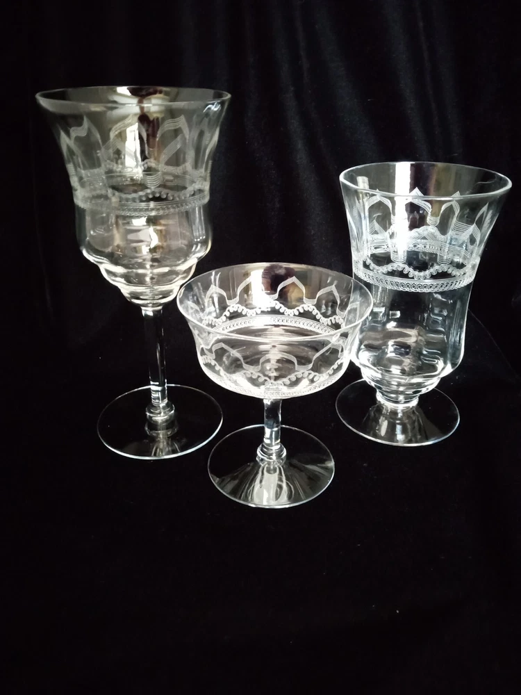 This is a set of 24 stunning late Victorian machine-etched stemware glasses in clear crystal. The glasses come in various types including champagne, tea, and wine glasses, featuring intricate etched patterns. Made by Fostoria, they exude a Victorian style and are perfect for adding elegance to any table setting or bar collection.