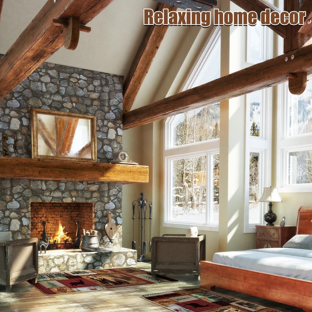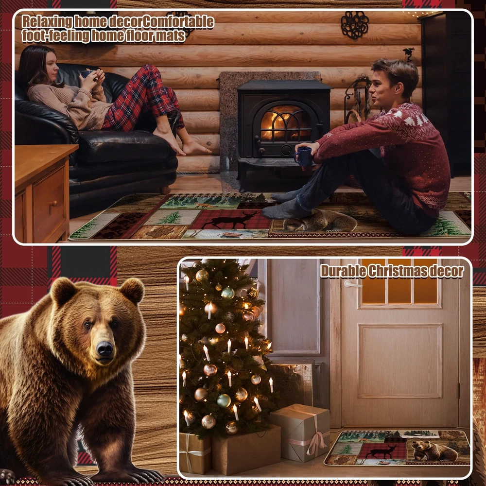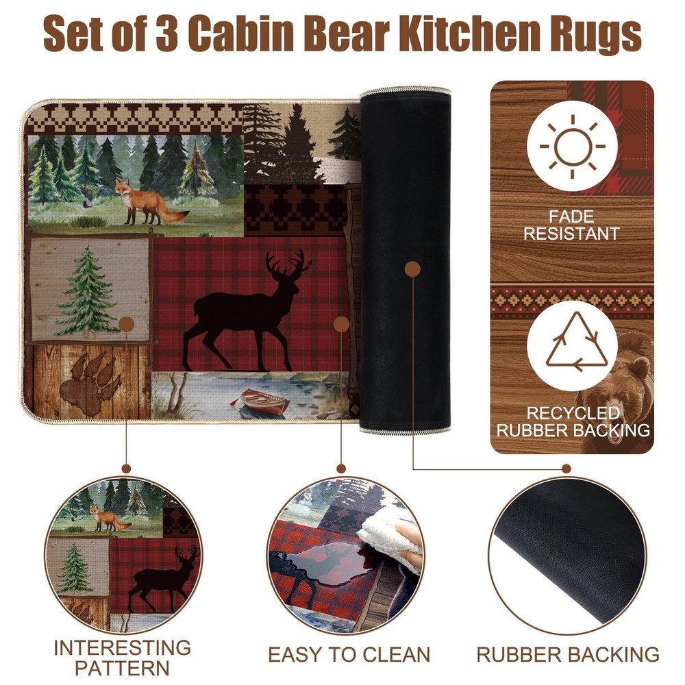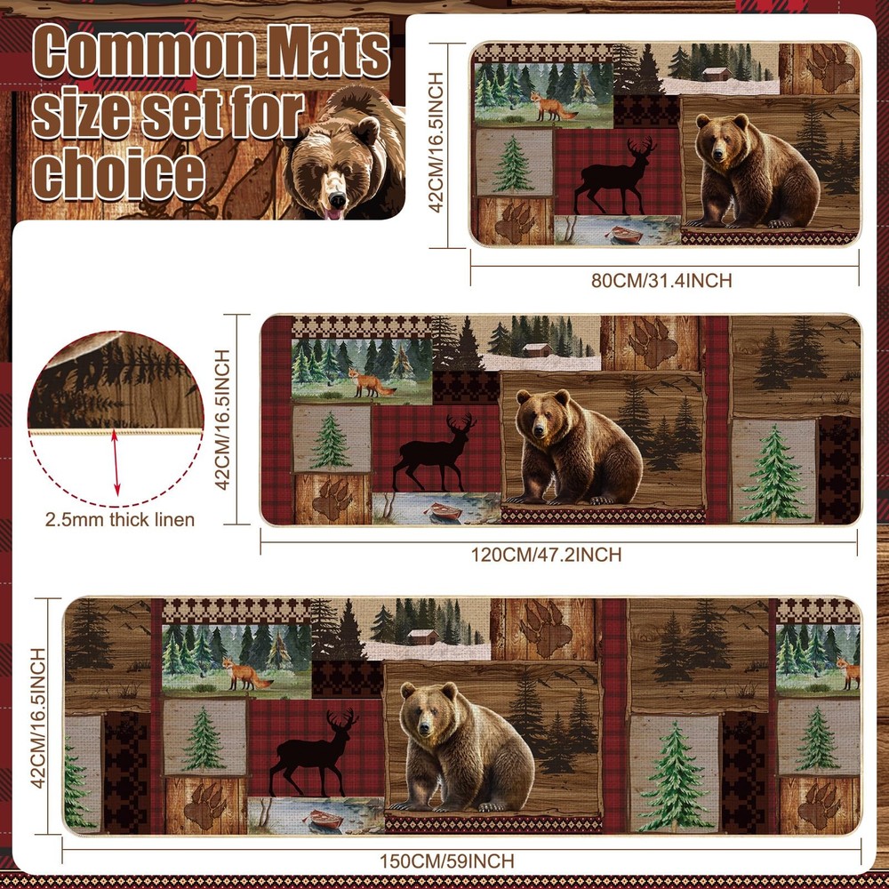 Features: Ideal Gift Choice: Our cottage rugs can also be a thoughtful and practical gift for Christmas or housewarming parties. Combining fashion and functionality, the cute bear pattern will be loved by people and adults. Various Application Scenarios: Our rugs have a variety of uses, such as kitchen, flooring, apartment necessities, kitchen accessories, laundry room decoration, etc. No matter where you choose to use it, the bear theme design will add a unique natural element. Specifications: Material: 2.5MM thick linen and rubber sole Color: multicolor Size: the set of three is 42*150/42*120/42*80cm Package includes: 3 x Cabin bear rugs Notes: Manual measurement, please allow slight errors on size. The color may exist a slight difference due to different screen displays. Bear Kitchen Rugs: our kitchen rug set includes three mats, measuring 16.54 x 31.5 inches, 16.54 x 47.24 inches, and 16.54 x 59.06 inches, with a thickness of 2.5 mm, which can provide optimal comfort and support to prevent slips and accidents Reliable Material: the country-style rugs are made of thick linen, which is sturdy and reliable, with a long service life; The bottom of the rug is equipped with rubber to maintain stability; The padded linen and rubber materials work together to absorb sound and minimize noise in the space Easy to Clean: our waterproof kitchen mat set only needs to be wiped with a small towel, or cleaned with a handheld vacuum cleaner or shaken outdoors to maintain its fresh look; Do not bleach Classic Design: featuring bears, mountains and woods, it adds a touch of wilderness to your home kitchen; The eye-catching bear pattern is sure to attract people's attention, adding freshness, character and charm to the space Carpet Set: these cottage rugs are versatile and can be applied to a variety of environments, whether it is the living room, bedroom, kitchen, or even the office; They can blend effortlessly with different decorative styles and can enhance the overall look of most spaces