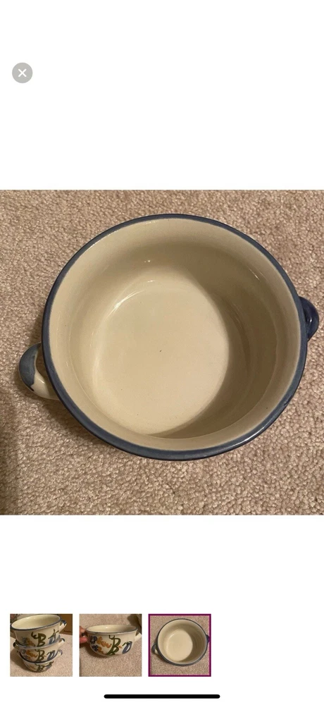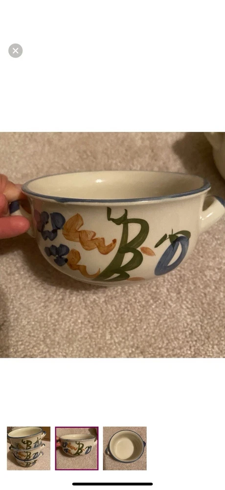Set of 3 Chi Jiang Stoneware soup bowls with two handles. Hand-painted.