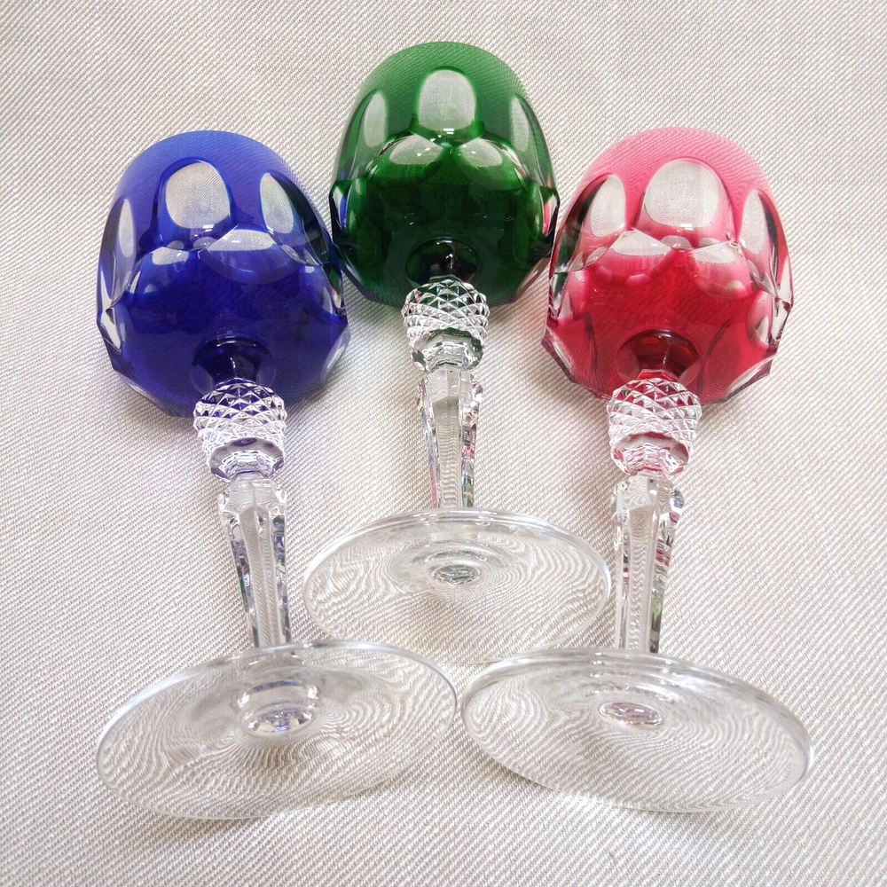 The product is a set of 3 vintage Nachtmann Antika wine glasses made of crystal, originating from Germany. Each glass features a unique multicolor overlay design, making them visually appealing and distinctive. These wine glasses are signed by Nachtmann, ensuring their authenticity and quality. Perfect for wine enthusiasts looking to add a touch of elegance and sophistication to their glassware collection, these glasses are a beautiful blend of craftsmanship and style.