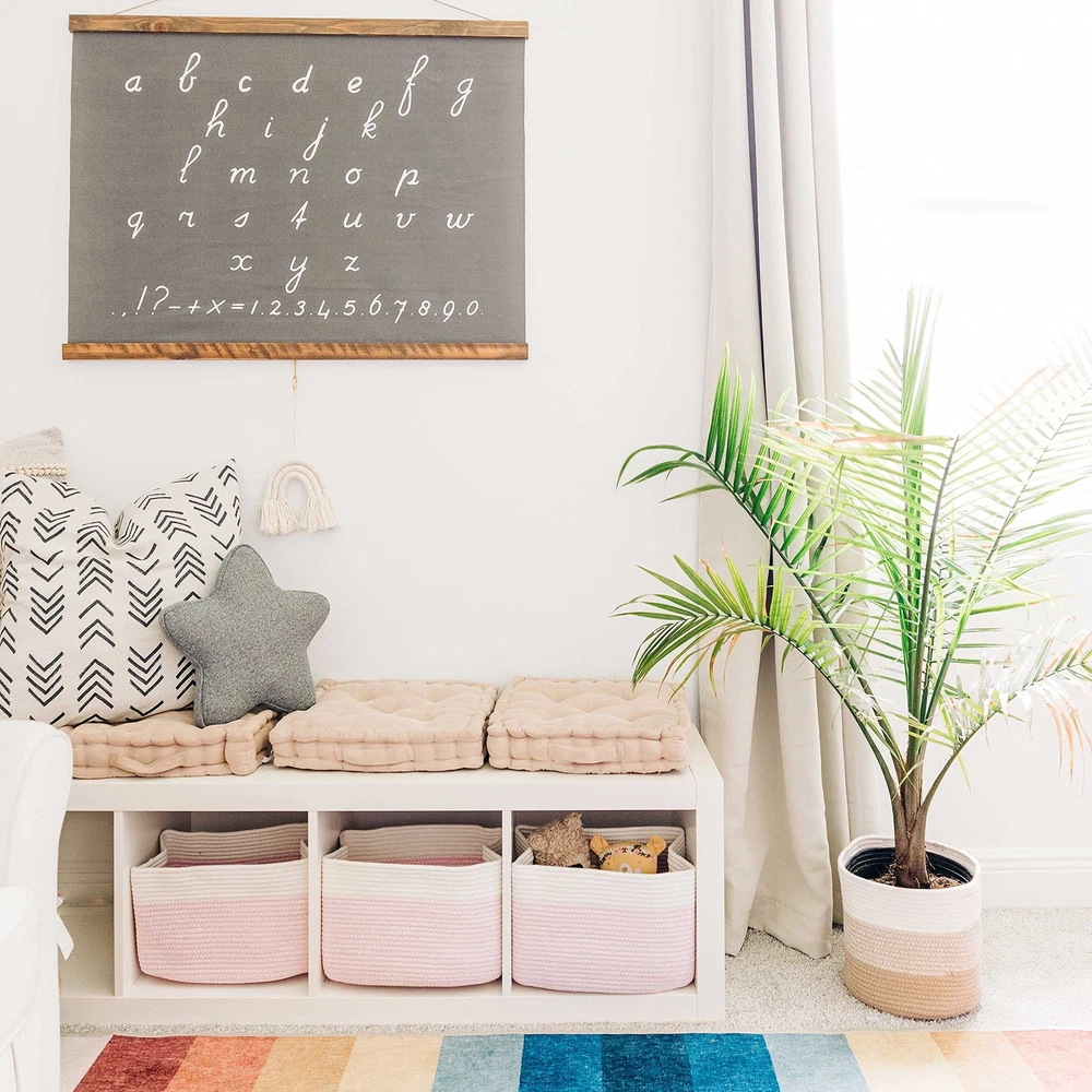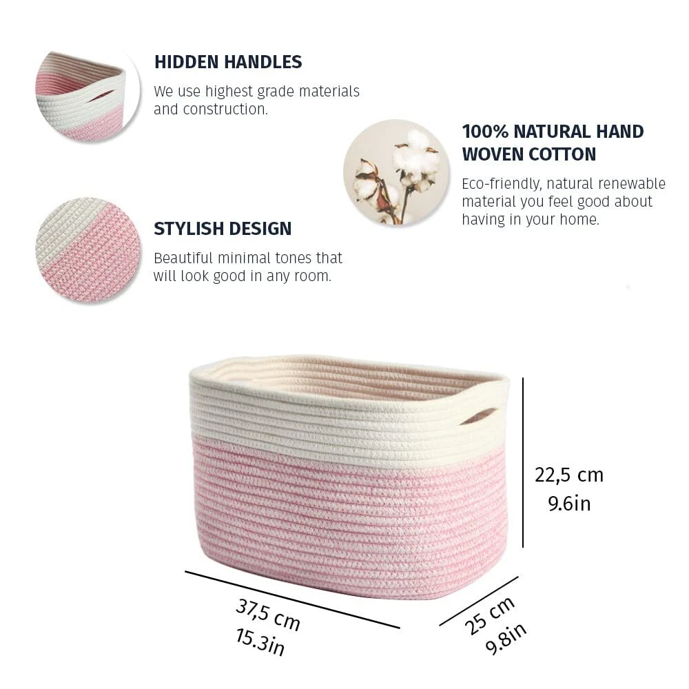 All-Purpose Cube Storage Baskets – These 15” x 10” x 9” rope storage baskets are ideal for keeping your everyday home life more organized and provide plenty of compact storage space for arts and crafts, classroom decor, kid’s toys, or nursery storage and room accessories Elegant Cotton Coiled Rope Cubes Design – A vintage feel with a modern touch these coiled rope baskets are made from tightly-woven cotton that’s strong, and more durable and resistant than regular wicker storage basket, linen closet organizers and storage baskets with lid. Vintage Colors to Match Every Style – Charming and stylish these versatile storage organizer bins come in 7 exclusive colors to match your home closet or style including 3-tone gray, blue / off-white, rainbow / off-white, pink / off-white, brown / off-white, gray / black, gray / honey, gray / off-white, honey / off-white, light honey / off-white, black, white and rainbow. Discrete, Built-In Carry Handles – These fabric rope baskets for storage also feature slim hand holds built right into the sides of each round basket for a seamless look that’s also functional. Perfect for picking up toys or carrying items around the house. Store Books, Blankets, Clothes, and More – The decorative shelf cube bin is deeper and taller than standard cotton rope baskets to provide plenty of depth when you’re storing home goods, hobby supplies, diapers, clothes, classroom storage or arts and crafts.