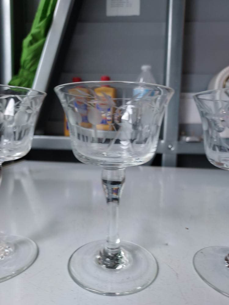 Elevate your home bar with this set of three beautifully etched cocktail glasses. Each glass stands 4 and one half inches tall and is 3 inches wide, perfect for your favorite mixed drinks. The clear glass allows you to see the vibrant colors of your drink while the etched features add a touch of elegance to your presentation. These glasses are perfect for any occasion, whether a cozy night in or a formal dinner party. Add them to your collection today and impress your guests with your hosting skills.