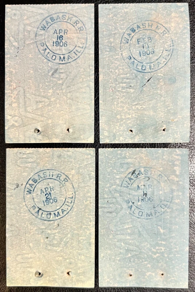 You are bidding on a Set of 4 190 6 Wabash Railroad Paloma, Illinois Ticket Stubs. All 4 are in very nice Railroad used condition and have the Wabash Paloma, Illinois Station Stamp on their back side. They measure approximately 2 1/8” x 3 ¼” and #7 70 shows to Marblehead , Ill for $. 63 cents, #7 80 shows to Chicago , Ill for $7.25 , #7 92 shows to Clayton , Ill. f or $. 39 cents, and #7 95 shows to Jacksonville , Ill. f or $1.93 . Please take a few minutes; I am sure you can see their true condition in my pictures and they are part of my description. This set of 4 190 6 Wabash Railroad Ticket Stubs will make a nice addition for any collection and they certainly could be Framed. All auctions must be paid for at the same time during checkout, and not individually, in order to receive the combined shipping discount . USPS Ground Advantage Mailing will be $4.75 and that will include insurance and a tracking number within the U.S.A. Thank You for Looking and Good Luck Bidding!