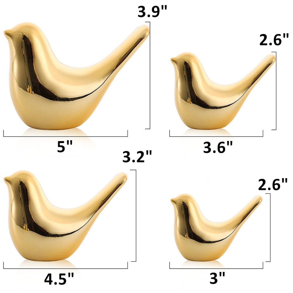 Premium Material: bird figurines are made of durable, lead-free and non-ceramic material, they are featured by the gold-plated surface that has great collection value. Minimalist Modern Decor: These small animal statues work as the perfect accent set for your any decor style, The simple but unique look will be sure to add some rustic charm to your home decoration. Wide Application: The ceramic bird figurine can be displayed on your book shelf, curio cabinet, fireplace mantel, tabletop centerpiece or window, which are suitable for the living room, dining room, kitchen, bathroom etc. Serve as Gifts: cute animal statues are ideal gifts for your family, friends for Christmas, Thanksgiving, housewarming, Mother's Day, birthday, wedding, anniversary and more. What You Will Get: You will get a value pack of 4 ceramic bird figurines. Approximate Dimensions: 2.99" L x 1.5" W x 2.6" H ( S ), 3.62" L x 1.65" W x 2.64" H ( M ), 4.45" L x 1.97" W x 3.15" H ( L ) and 5" L x 2.28" W x 3.86" H ( XL ).