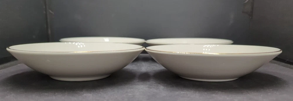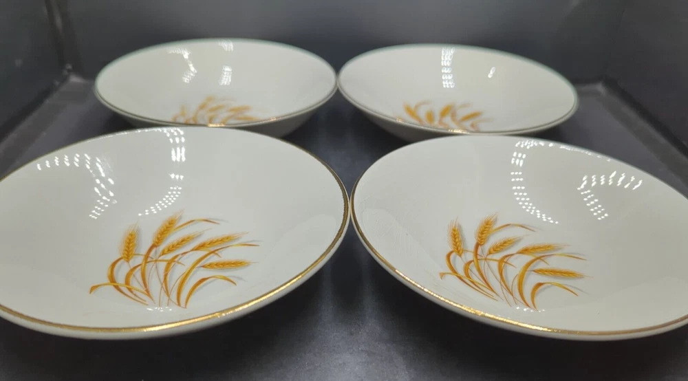 Set of 4 Homer Laughlin Golden Wheat Berry Dessert Bowls 22K Gold Trim USA READ. Fairly nice vintage condition with no chips or cracks, no scratches or wear on the gold trim. There is age related crazing on two of the bowls. Please see the last 2 photos for close-ups. I discovered these were premiums in boxes of Duz detergent in the 1950's with a new piece for your collection each week and were highly prized by mothers and grandmothers alike. There are two different maker's marks on the underside of the bowls so they must have been made at different periods and except the marks the bowls have the same design. All of my items are carefully packed for shipping, no matter their value - $5 items are wrapped with the same care as a $200 item. My goal is to have your purchase arrive safely. Large, heavy and fragile items are harder to use combined shipping with but just ask if you would like to purchase more than one item and I am more than happy to do so if feasible. Measurements are approximate or as close as I can get. Also, the color you see many not be the exact color depending on your computer or phone settings. Unpaid items will result in the buyer being blocked from further purchases. Please remit payment right away so we can get your item shipped out quickly.