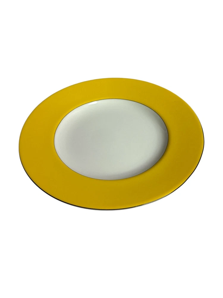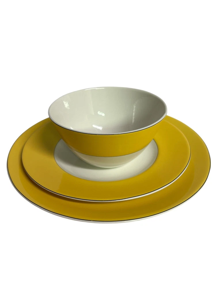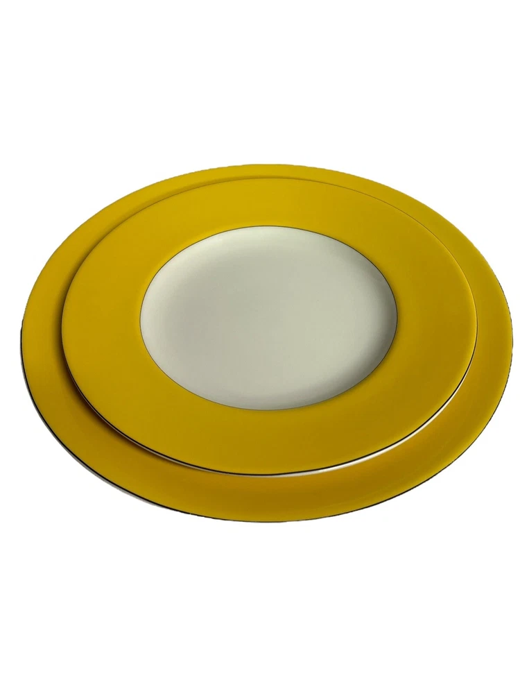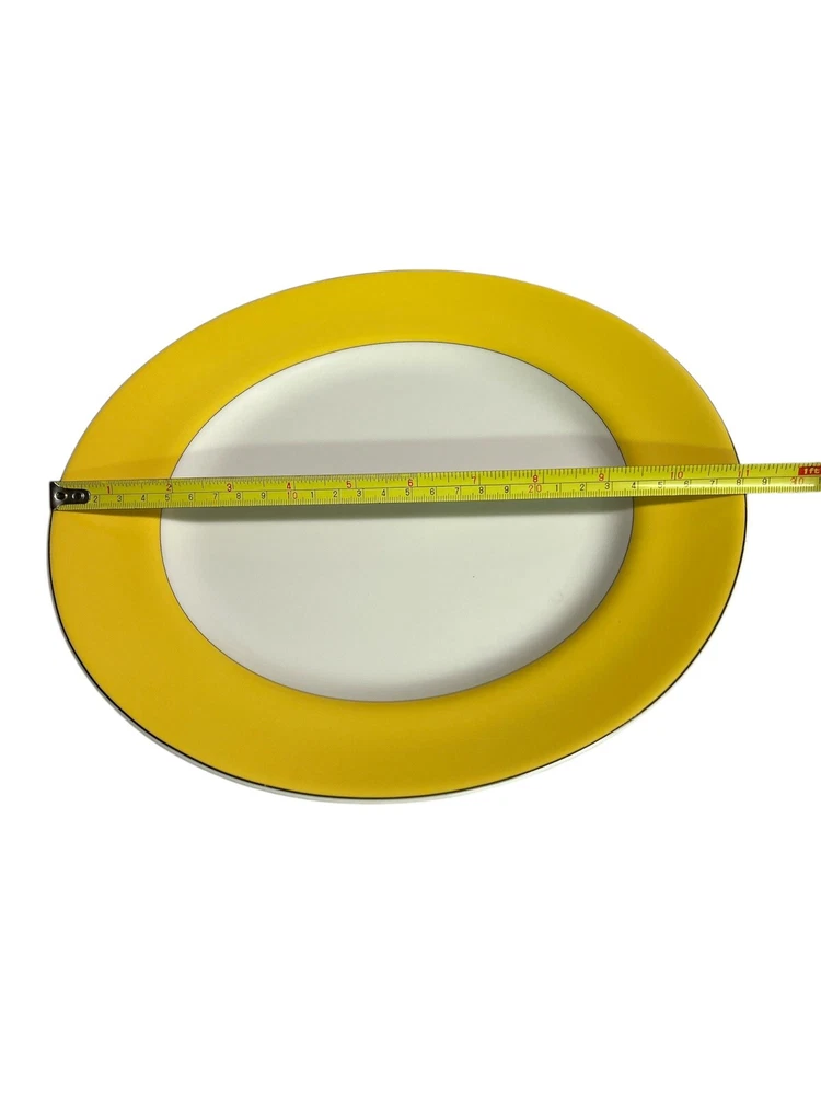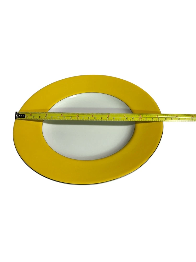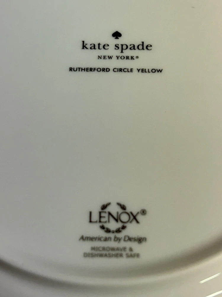 Add a touch of elegance to your dining table with this beautiful set of four Lenox Kate Spade Rutherford Circle dinner plates, bowl and mug. These are made of high-quality porcelain and come in a bright yellow color that will complement any table setting. The plates are not only stylish but also practical, as they are microwave and dishwasher safe. They feature a printed backstamp and are made in the United States. Rarely used and in amazing condition! No cracks, chips, or breaks. Please refer to all pictures.