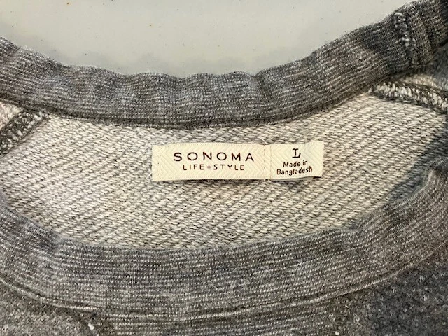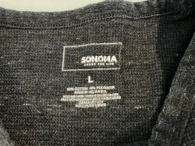 Set of 4 Men's Long Sleeve Shirts- Includes Urban Pipeline Dark Gray Thermal Shirt- Size L- 60% Cotton/40% Polyester; Sonoma Dark Gray Flecked Thermal Shirt- Size L- 60% Cotton/40% Polyester; Sonoma Dark Gray Flecked/Black Double Knit Shirt- Size L- 50% Rayon/30% Cotton/20% Polyester; Sonoma Light Gray Sweatshirt- Size L- 69% Cotton/20% Polyester/11% Rayon. In good condition for age and use. No rips or tears. No stains. See Photos.