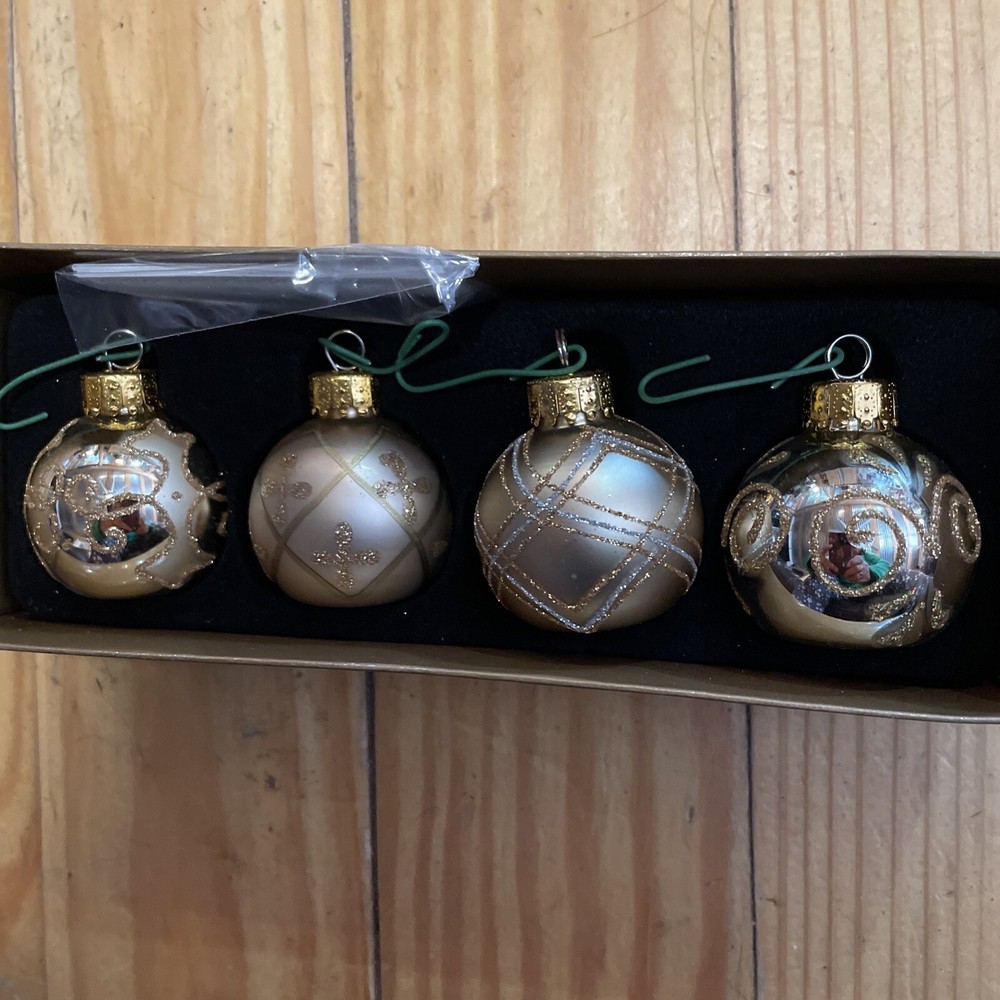 Set of 4 Michaels Glass Christmas Ornaments Goldw/Glitter & Flat Bottom 1.57”NIB