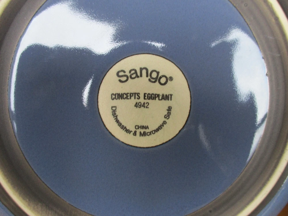 gtin13:Does not applyShape:RoundAntique:NoItem Height:naNumber of Items in Set:Four-PieceCare Instructions:Machine Washable up to 140°FType:Salad PlateTime Period Manufactured:2010-2019Theme:eggplantStyle:EmpireCountry/Region of Manufacture:ChinaEra:21st Century (2000-now)Set Includes:Salad PlateMaterial:StonewareManufacturer Warranty:naItem Width:naFeatures:Dishwasher Safe, Microwave SafeBrand:SangoOccasion:All OccasionsOriginal/Licensed Reproduction:OriginalVintage:NoMPN:N/ASeller Notes:“PRE-OWNED. EXCELLENT CONDITION.”UPC:Does not applyHandmade:NoProduct Line:sangoOrigin:AmericaPattern:Concepts EggplantItem Length:naBackstamp:PrintedFinish:Lead-Free GlazeProduction Technique:PotteryPlate Diameter:8 1/2"Production Style:Art PotteryItem Weight:naColor:White/Blue