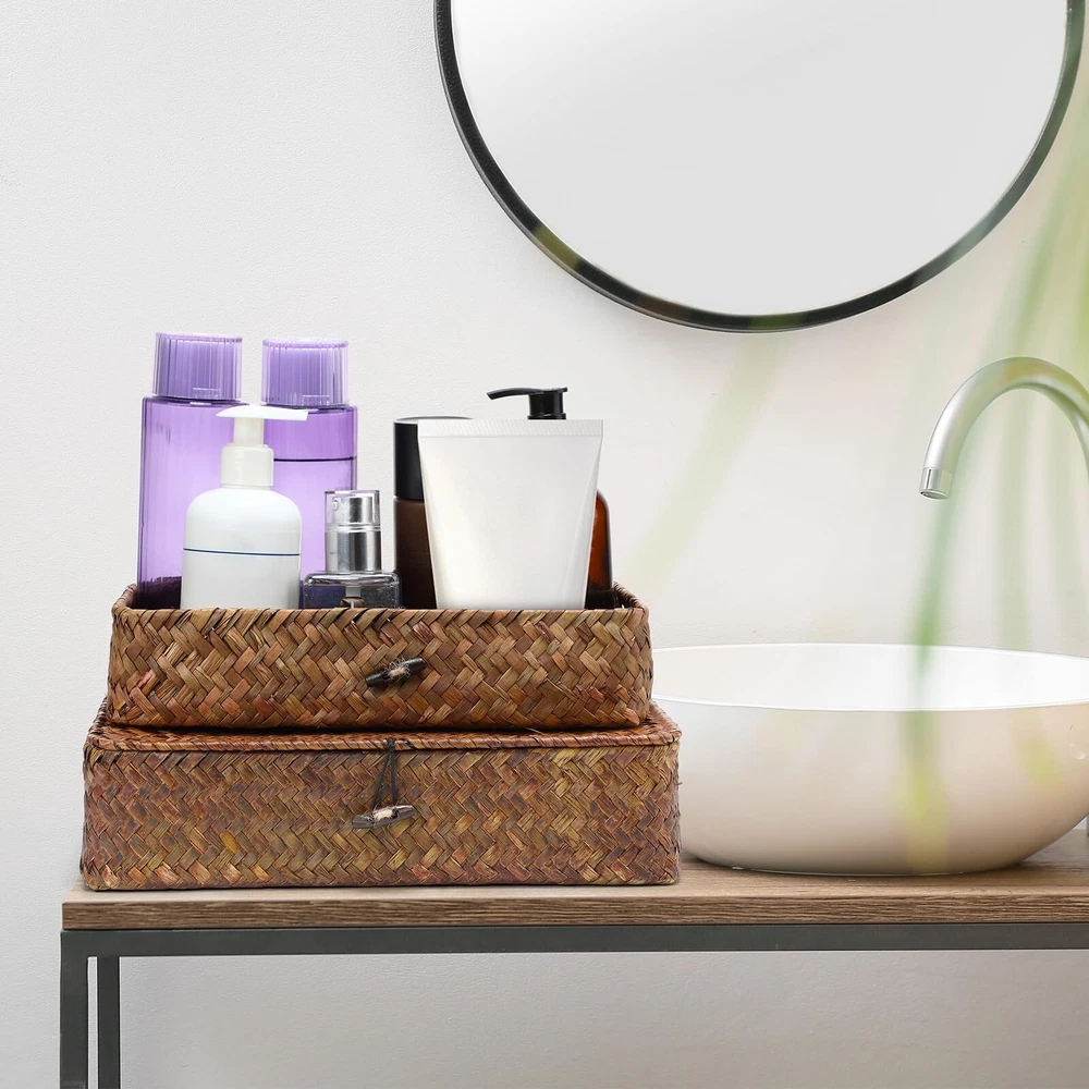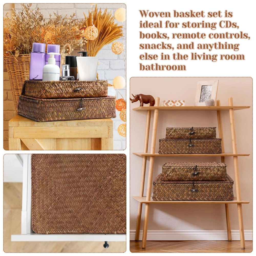 Seagrass Basket with Lid Set: we will provide you with 4 pieces of decorative storage boxes with lids, designed in 4 different sizes, suitable size to place on shelves, tabletop, drawer, bathroom counter, kitchen cabinet and more Reliable Material: our woven baskets for storage with lid are made of quality seagrass material, lightweight but strong enough, a combination of natural materials, and no unhealthy materials, which can be safely applied in your daily life 4 Sizes: the wicker storage basket comes with 4 sized trays, namely, approx. 10.24 x 6.3 x 2.17 inches/ 26 x 16 x 5.5 cm, 14.17 x 11.81 x 3.54 inches/ 36 x 30 x 9 cm, 12.6 x 11.02 x 2.95 inches/ 32 x 28 x 7.5 cm and 11.02 x 9.45 x 2.52 inches/ 28 x 24 x 6.4 cm, which can meet your different size needs Safe and Convenient: the flat basket is designed with a lid, keeping your room tidy and neat, enabling you to find what you need fast; Meanwhile, there is a wood button and strap for locking, inner items would not fall out once when it is locked Decorative Tabletop Organizer: the wicker storage bins can be applied in living room, dining room, kitchen counter, ottoman, coffee table, bathroom counter, vanity, desk, farmhouse, keep the things in one place and add a rustic look to your home