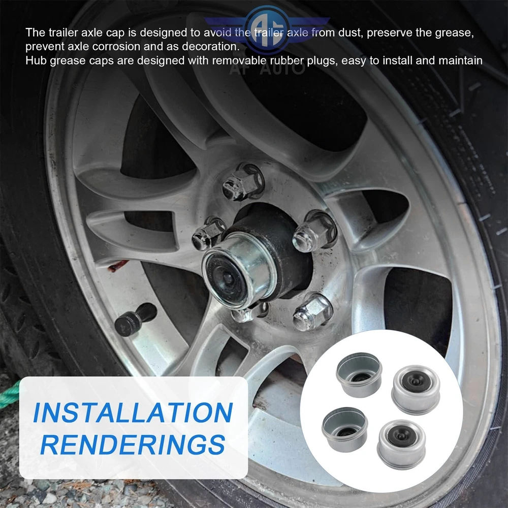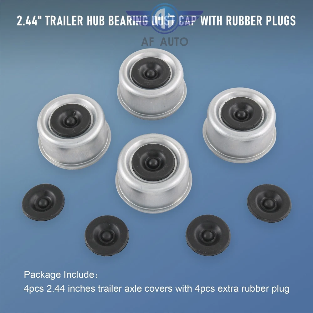 Product Description 2.44" Trailer Axle Dust Cap with Rubber Plugs - 4PCS Fitment Fits Most 2000-3500 Pound Axles Fit standard brake & idler trailer axles for most 4 lug & 5 lug axles with 2.44" diameter cap Package Include 4pcs 2.44 inches trailer axle covers 4pcs extra rubber plug Dimension Reference image size data The trailer axle cap is designed to avoid the trailer axle from dust, preserve the grease, prevent axle corrosion and as decoration Hub grease caps are designed with removable rubber plugs, easy to install and maintain In order to install firmly, the axle dust cap is slightly larger by design. You need to knock it into place using a wood block and hammer or rubber mallet, to prevent denting the cap while installing powered by