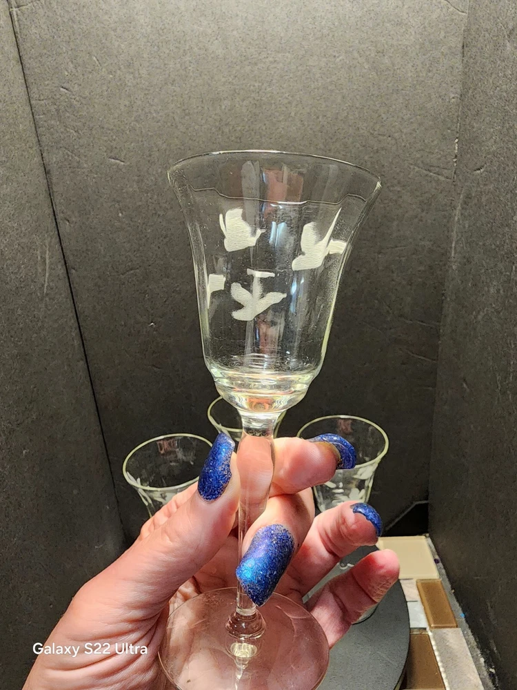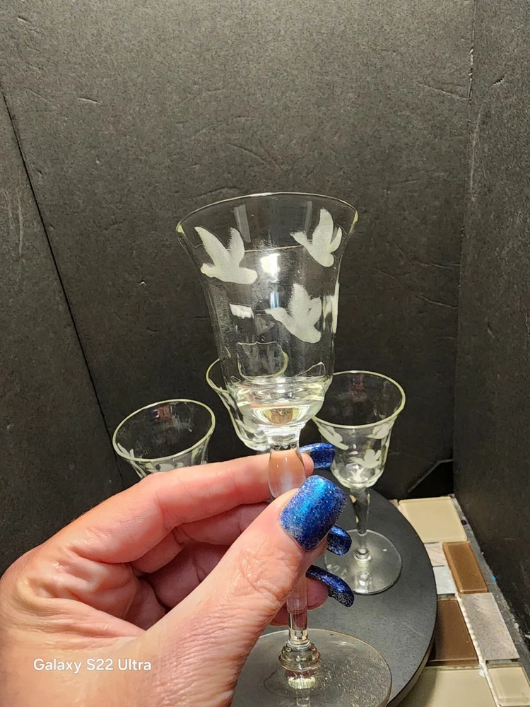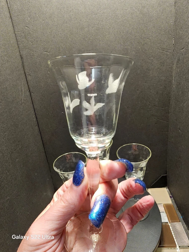 Add a touch of vintage charm to your drinkware collection with this set of four Art Deco bird etched crystal wine and spritzer glasses. The intricate etched designs of these glasses make them a stunning addition to any table setting and perfect for any occasion. Crafted from high-quality crystal, these glasses are durable and elegant, making them a great investment for any home bar or collection. The set includes four glasses, each featuring a unique bird design, adding a touch of personality to your drinkware.