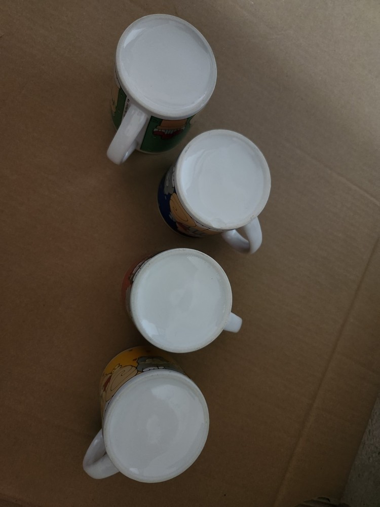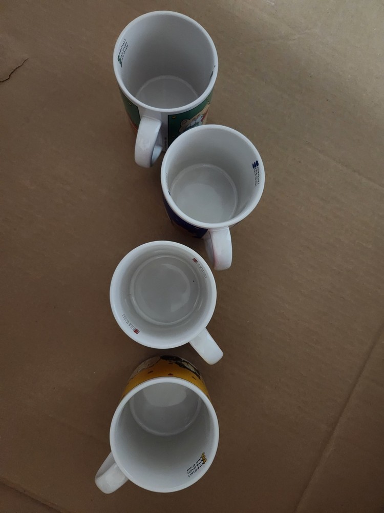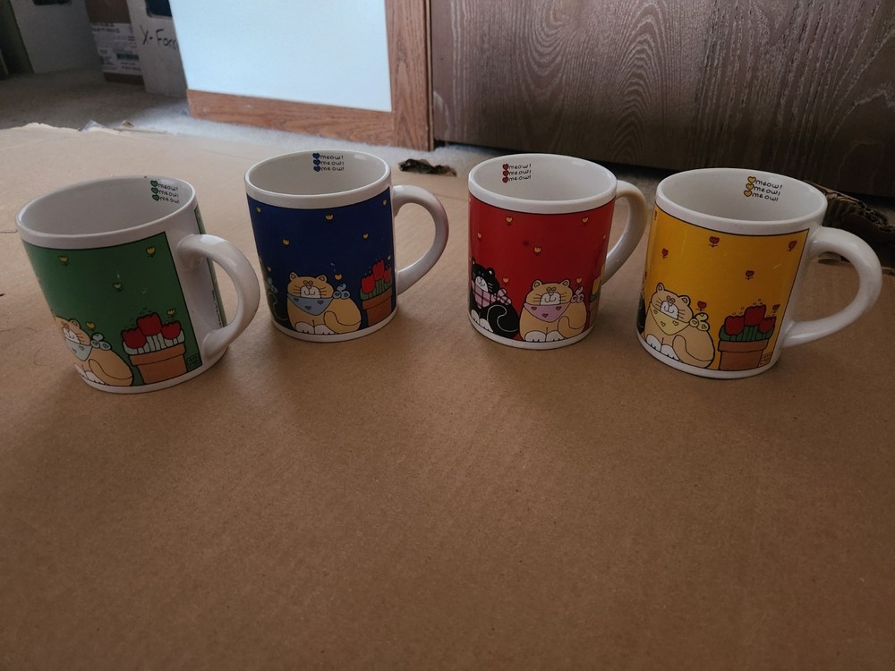 Set of 4 coffee mugs with cat designs(meow!). Condition is Used. Shipped with USPS Ground Advantage.