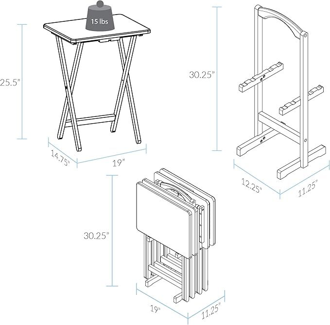 Product Description Item Dimensions : 14.8L x 19W x 25.5H inches. Material : Wood. No assembly required Set of 4 folding TV tables and matching storage stand for easy storage Great for living room get togethers when you need that extra table space Solid wood construction for increased durability and longevity with light an easy assembly Tray Stand Dimensions: 30.25 inches high x 11.25 inches wide x 12.25 inches deep Tray Dimensions: 25.50 inches high x 19 inches wide x 14.75 inches deep; Total Weight: 27.75 pounds With this 5-piece Folding Table Set you can have a table anywhere in your home. Made of 100-percent solid wood, this set includes 4 folding tables and a convenient storage stand, which is great for transportation. Perfect for TV meals or family meals that make their way out of the kitchen or dining room.