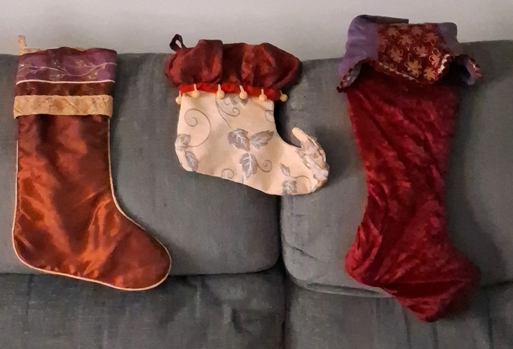 This set of 5 fabric Christmas stockings features a variety of festive colors including red, gold, multicolor, and cream, with a solid floral pattern. Designed as Christmas stockings in a boot shape, these decorative items are perfect for adults to display during the holiday season. Made of fabric, each stocking is ideal for adding a touch of Christmas spirit to any home or garden décor. With no filling included, these stockings are ready to be filled with ornaments or other decorations to complete the festive look.