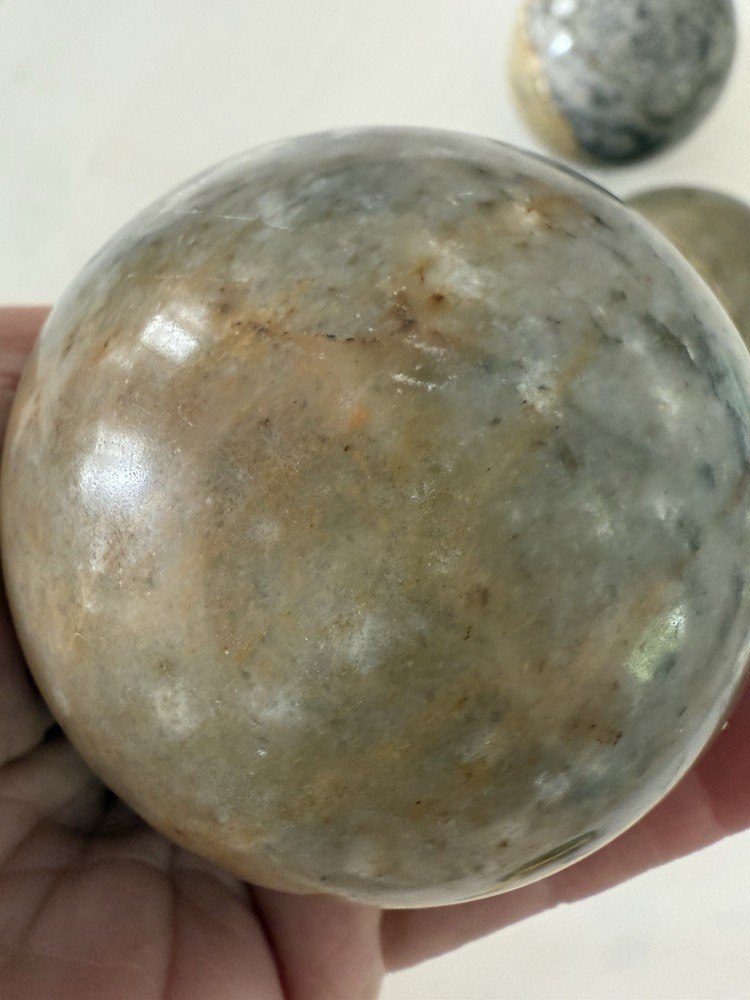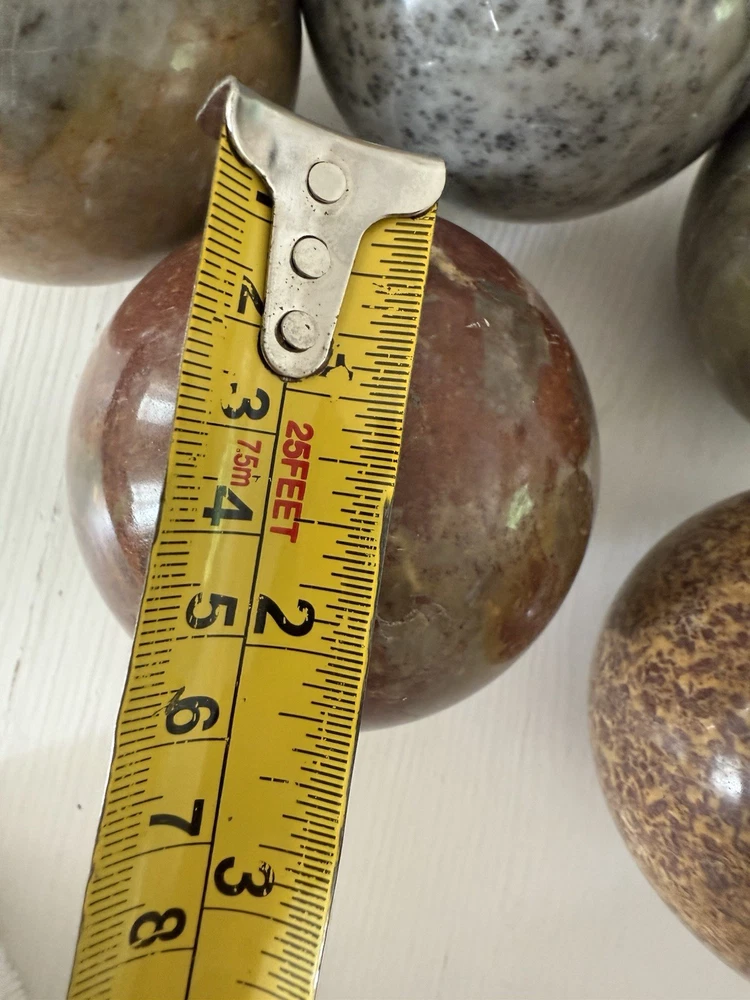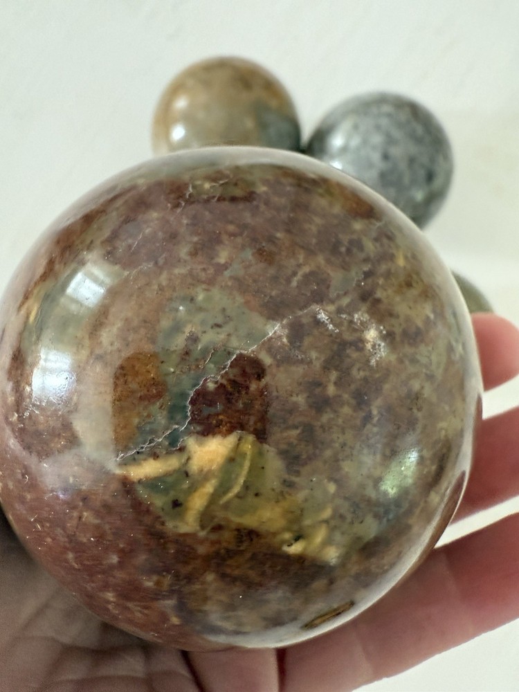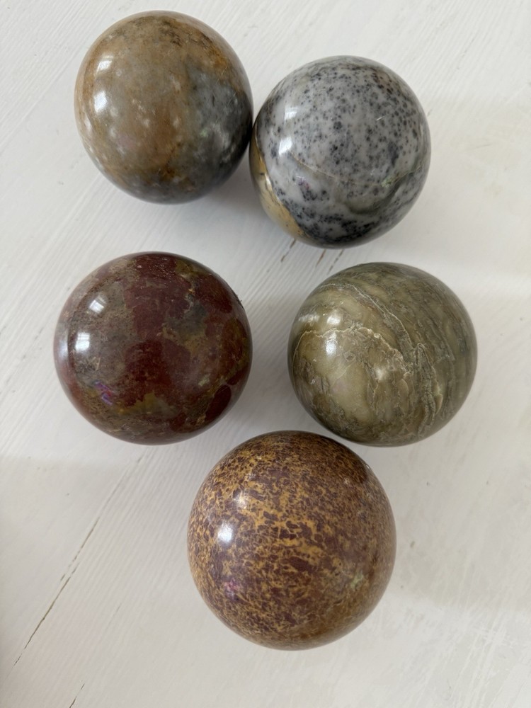 Bring timeless beauty and natural energy into your home with this set of 5 polished natural stone crystal spheres. Each ball measures approximately 3 inches (7.5 cm) in diameter and features unique colors and patterns of jasper, onyx, and other natural stones. Perfect for collectors, home décor, meditation, or as a thoughtful gift. • Lot of 5 spheres – all included • Size: approx. 3” (7.5 cm) each • Polished smooth finish • Natural stone – every piece is unique • Great for feng shui, display, or energy work ✨ Add a touch of elegance and grounding energy to your space.