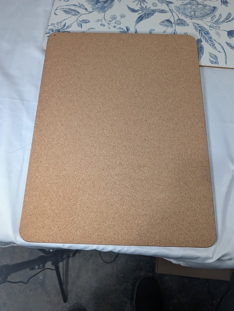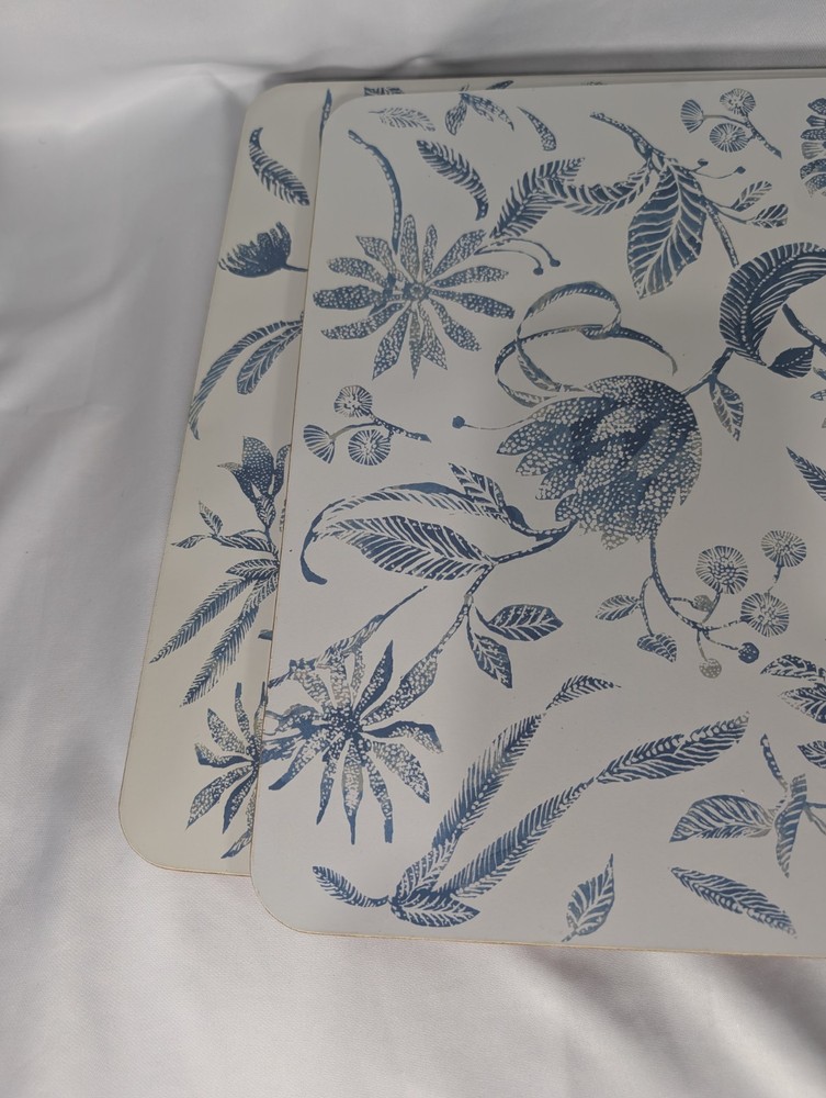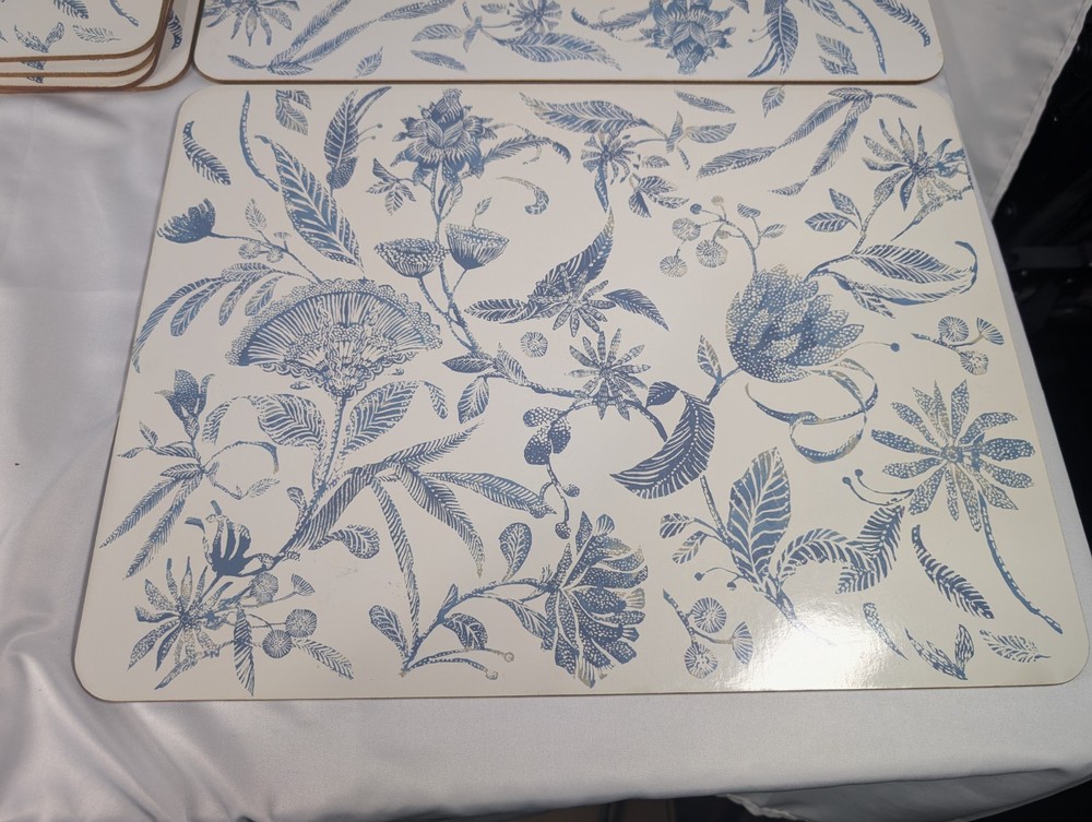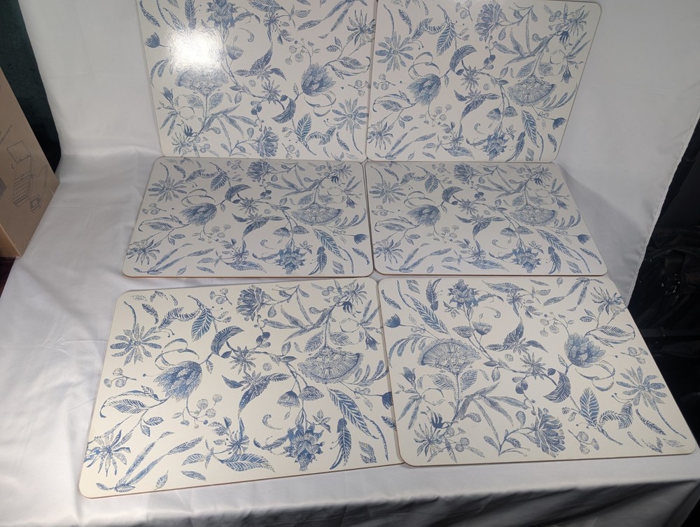 Set of 6 Blue & White Floral Cork Rectangular Placemats. 2 have some yellowing from use. Please see last image for contrast between a less used and used placemat. These placemats provide solid protection for quality furniture while being easy to clean and beautiful to look at.