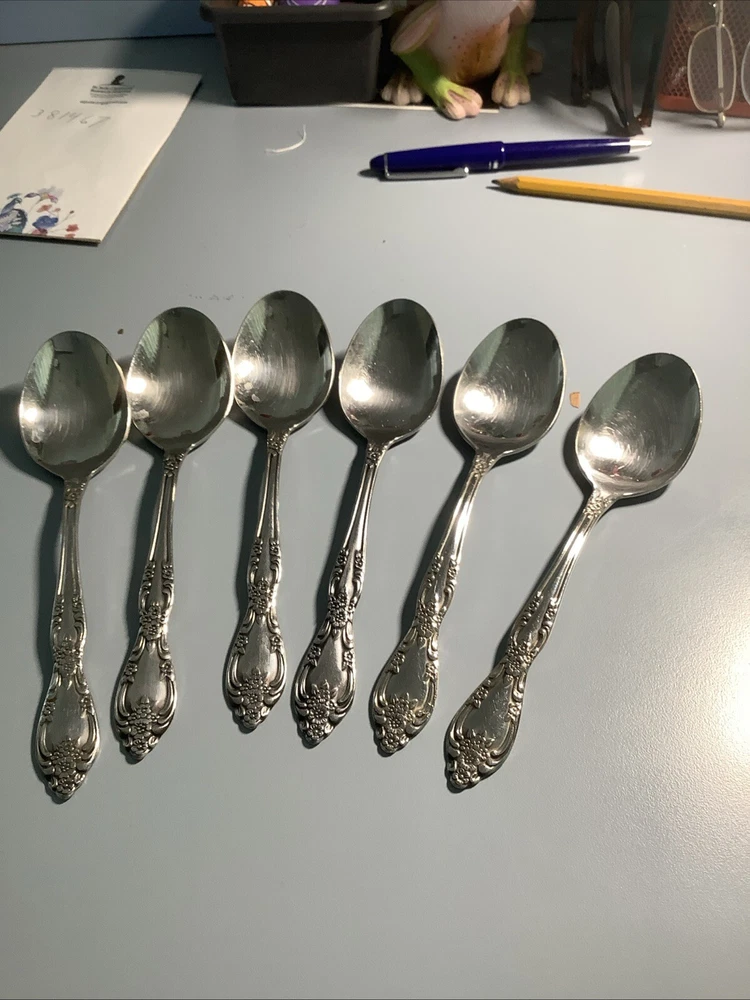 You are getting six place/soup spoons. They are in good condition with every day uses and scratches. They are about 7 inches long.