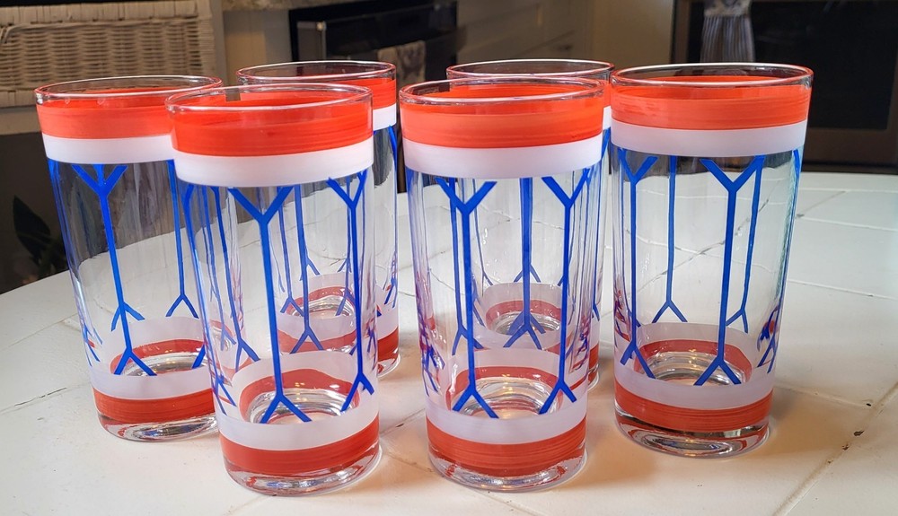This set of six Gad Fad style glass tumblers is perfect for all occasions. The red, white, and blue colors are handpainted on each tumbler, making them unique and one-of-a-kind. Each tumbler has a capacity of 9 oz and stands at 5.75 inches tall. The drum design make them perfect for mid-century modern decor. The Americana theme and glassware type make them great for drinking glasses. This set includes six tumblers and is perfect for serving drinks to your guests.