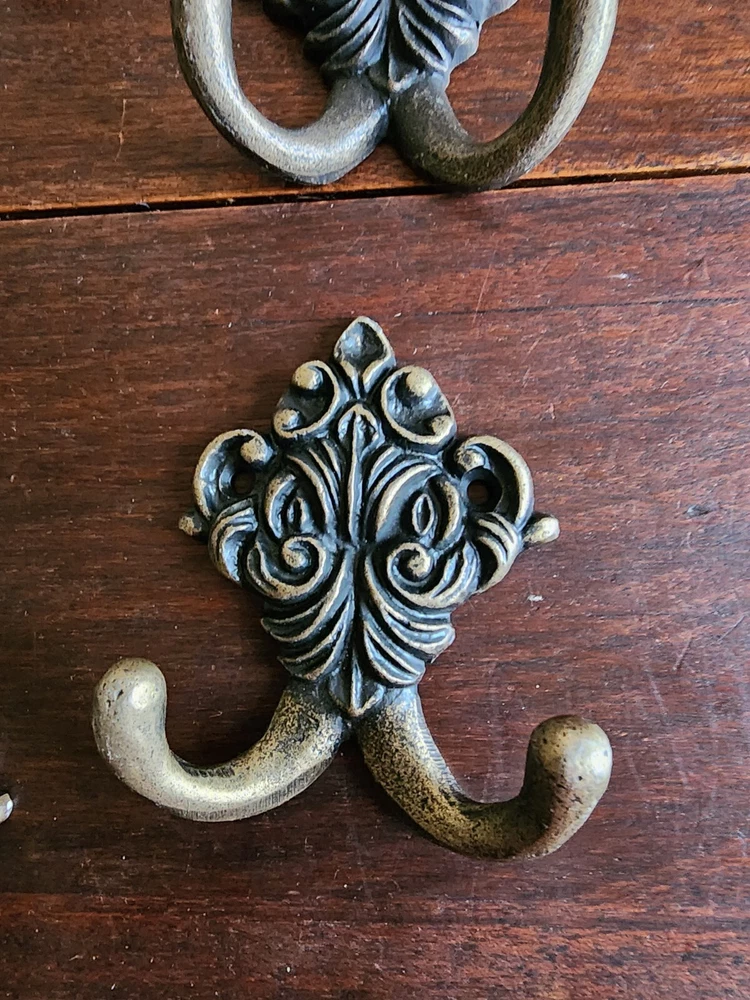 Set of 4 Wrought Iron Metal 2 Peg FLoral Wall Hanging Hook Coat/Towel Gold Tone