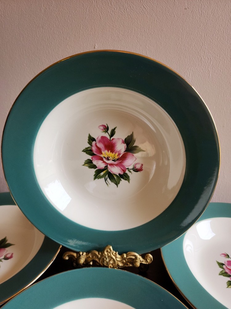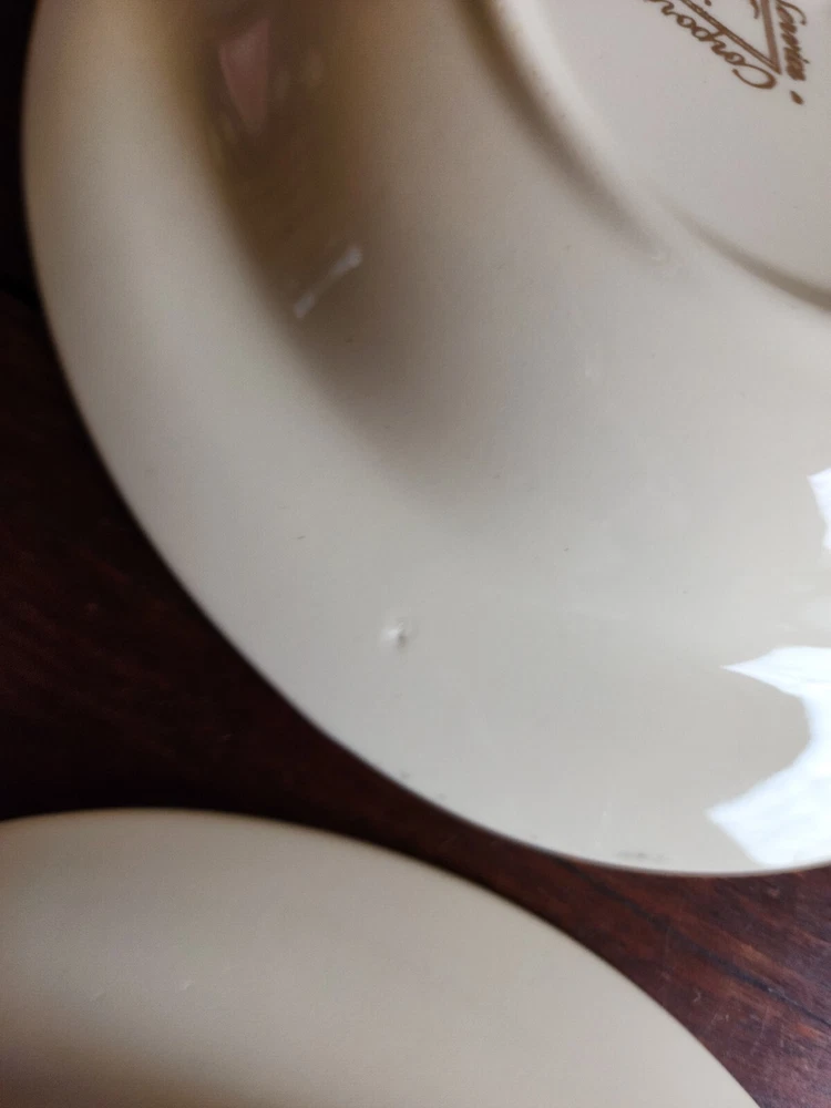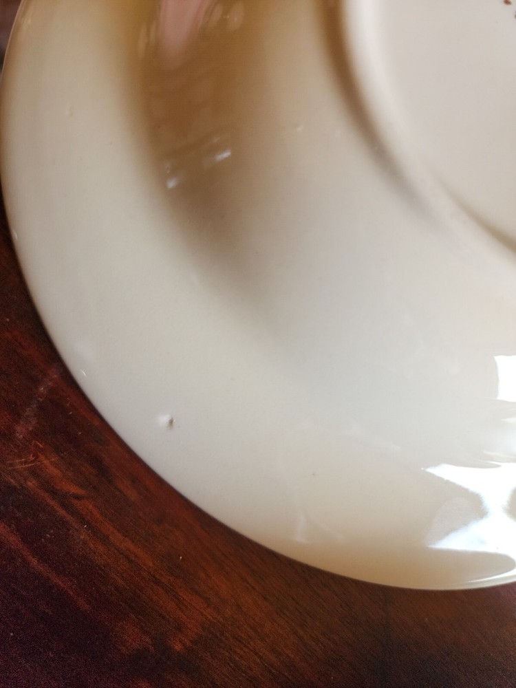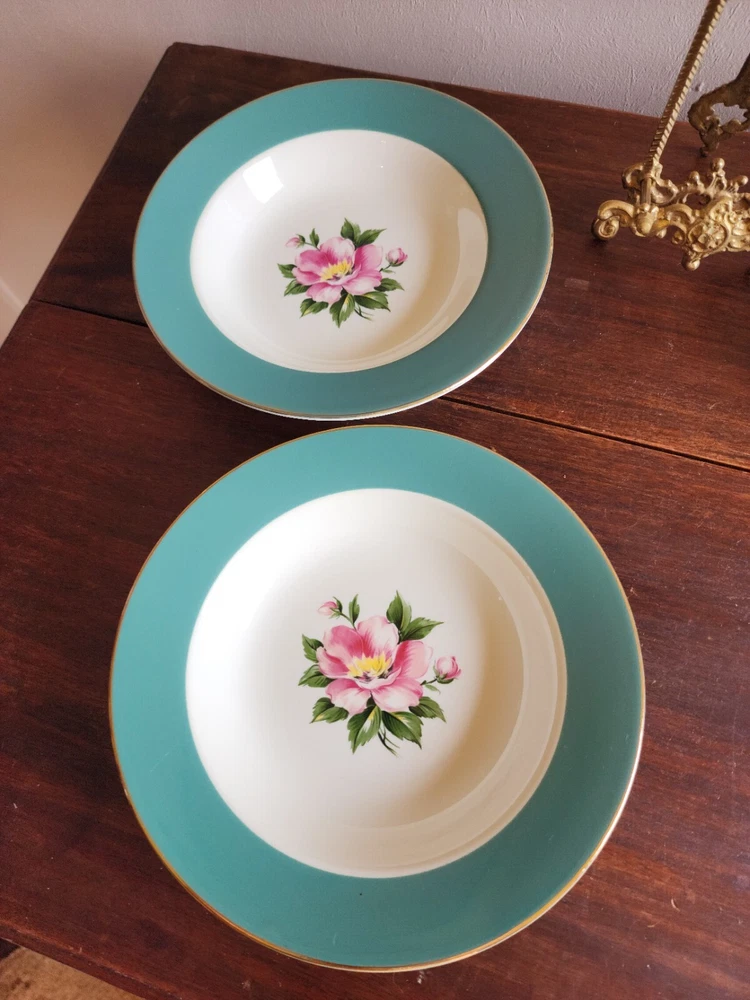 2 bowls have a tiny chip on each one. One bowls has a green spot on the green area. On the back of one has a mark. Please look at all pictures. size 8-3/8 inch