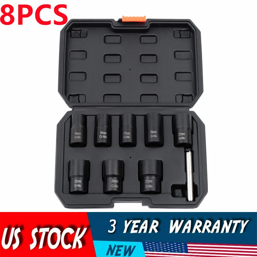 Set of 8 Impact Bolt Extractor Nut Remover Kit Stripped Extraction Socket Tools 8 Pcs Wheel Lug Nut Remover Remove Damaged Locked Nuts Bolts Extractor Tools NEW Description~ Description What if a bolt or nut is rusted or damaged and cannot be removed with a wrench? Then you'll need a bolt extractor that removes them easily. Our bolt extractor set comes in 8 different sizes to fit different diameter nuts or bolts. The 42Cr-mo material and manganese phosphate surface treatment make these bolt extractors very strong and durable with long service life. This will be a good helper for you. Key Features Strong and Durable: The item is made of 42Cr-mo, which is relatively strong and stable. It is also not easy to damage or rust under proper use and is very durable. Ergonomic Design: This cylindrical rod is a very ergonomic design. It is smoother and more comfortable to hold while you are working. You will not feel fatigued even after long hours of use, giving you great comfort. Optional Sizes: This item is equipped with 8 different diameter bolt extractors. You can choose bolt extractors with different diameters according to the size requirements of the bolts to be removed. Manganese Phosphate Treated Surface: The surface of these bolt extractors is treated with manganese phosphate, which improves the abrasion and corrosion resistance of the item. This gives the item a longer service life. Reverse Spiral Design: These bolt extractors have a reverse spiral design inside, which allows for better tucking and clamping of damaged nuts. So they can be easily removed. Easy to Carry: This item has a toolbox that is easy and convenient for you to take to the workplace you like without much effort. It is a good helper for you to improve work efficiency. Great Helper at Work: This set can help you to take out the damaged nuts or bolts easily. This is very time and effort-saving and is a good helper at work. Guaranteed Customer Service: We aim to provide quality products and services. If you have any problems, please feel free to contact us. We will reply and solve the problem for you as soon as possible. Details Toolbox: This item comes with a toolbox that will keep these bolt extractors well organized. So these bolt extractors can be easily stored and carried. Clear Markings : These bolt extractors have diameter numerical markings that are laser engraved with great clarity. This makes it easy for you to find a suitable diameter bolt extractor. Application This set can be used in factories, garages, and other places to remove damaged nuts and bolts of various sizes. Specifications Color: Black Material: 42Cr-mo Surface Treatment: Manganese Phosphate Gross Weight: 1.6kg/3.53 lbs Net Weight: 1.2kg/2.65 lbs Toolbox Size: 24*16.5*5cm/9.5*6.5*2" Bolt Extractor Diameter: 14mm/0.55"; 16mm/0.63"; 17mm/0.67"; 19mm/0.75"; 21mm/0.83"; 22mm/0.87"; 24mmm/0.94"; 27mm/1.06" How to Use Choose a bolt extractor with a diameter comparable to the nut or bolt that needs to be removed. Attach a drill to the bolt extractor and attach the end with the reverse spiral to the bolt or nut. Repeat the 360° rotation and the nut or bolt can be removed. If the damaged nut or bolt is stuck inside the extractor, you can use a rod to knock it out. Package Included 8* Bolt Extractors 1* Rod 1* Toolbox Notes Please allow the slight color difference caused by the shooting light and 1-3cm error due to manual measurement, and make sure you do not mind before you order. tu1 Payment Delivery details Terms of sales About us Contact us Payment We accept ebay payment 。 Fees such as import duties, taxes are not included in the item price or shipping costs. These charges are the buyer's responsibility. Delivery details Shipping: 2-9 working days to: USA Terms of sales We maintain high standards of excellence and strive for hundred percent customer satisfaction. Feedback is very important to us. We hope that you contact us immediately before you give neutral or negative feedback, so that we can address your concerns. It is impossible to address issues if we do not know about them! About us Your satis faction is our ultimate goal. We work hard to earn your trust and future business. Our certified technicians have tested each item before shipping. The unit comes with 1 year limited warranty on all manufacturing defects. a) If you receive a defective item, you may return it or ask for a discount. Please contact us within 14 days after you receive the package. b) What you returned must be intact and in its original packaging as re? u. Customer is responsible for shipping costs of the returned item. c) We will cover the cost of shipping back t with the shipping rate indicated in the registration page. We will send you a new unit or refund the full payment you paid. Thank you. Contact us Business Hour Business Hour: Monday To Friday: 8:30 AM to 5:00 PM (Beijing China time) Due to time zones, our reply to your questions may not be immediately. But within above working time, we will reply your email within 24 hours. If it's non-workdays, please kindly be patient and wait till Monday. Please contact us with ebay message. Please feel free to contact us if you have any questions. Monday To Friday: 8:30 AM to 5:00 PM (Beijing China time) Due to time zones, our reply to your questions may not be immediately. But within above working time, we will reply your email within 24 hours. If it's non-workdays, please kindly be patient and wait till Monday. Please contact us with ebay message. Please feel free to contact us if you have any questions.