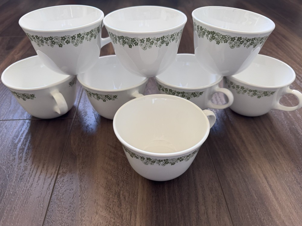 This set of 8 vintage Corelle Crazy Daisy Spring Blossom handle coffee/tea cups features a floral pattern in green and white, with a round shape and a glossy finish. Made of milk glass in a Mid-Century Modern style, these mugs are an original production from the 1970s in the United States.