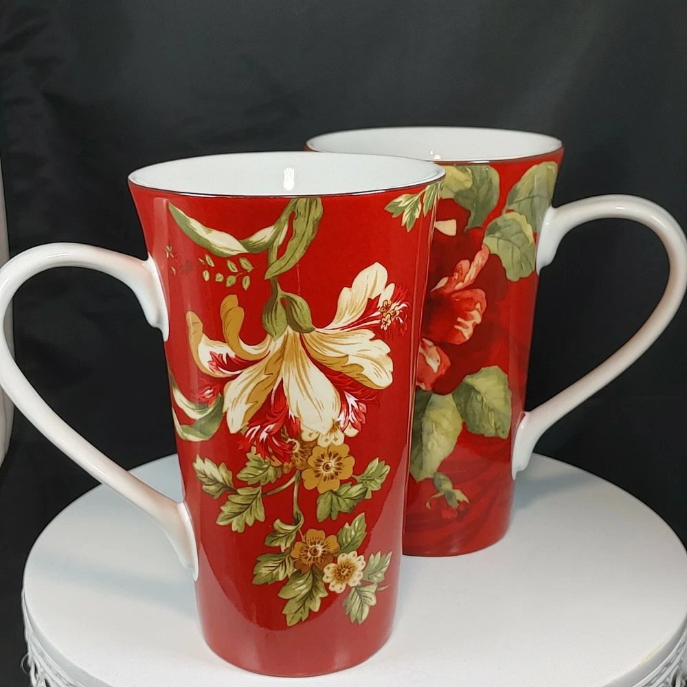 Set of Two Large Coffee Mugs Red Floral 222 Fifth International 16 oz Size Two patterns, Belize and Fleur Rouge. Extra Large mugs, hold appx 16 ounces Like new condition Tall, 6-1/2" Ships FAST from Canada with Tracking Thanks for shopping our store We take extra care in packaging to ensure safe arrival of your item. All parcels are shipped with tracking so that you can monitor the shipment progress and delivery. CDN to USA Currency exchanges upon payment Please Follow Our Store for Updated Weekly Items . ** Have a Great Day!. Happy Holidays! USA buyers save with currency exchange on purchase.We ship UPS, Canada Post and Fedex as postage requires. Thank you for being a valued customer!