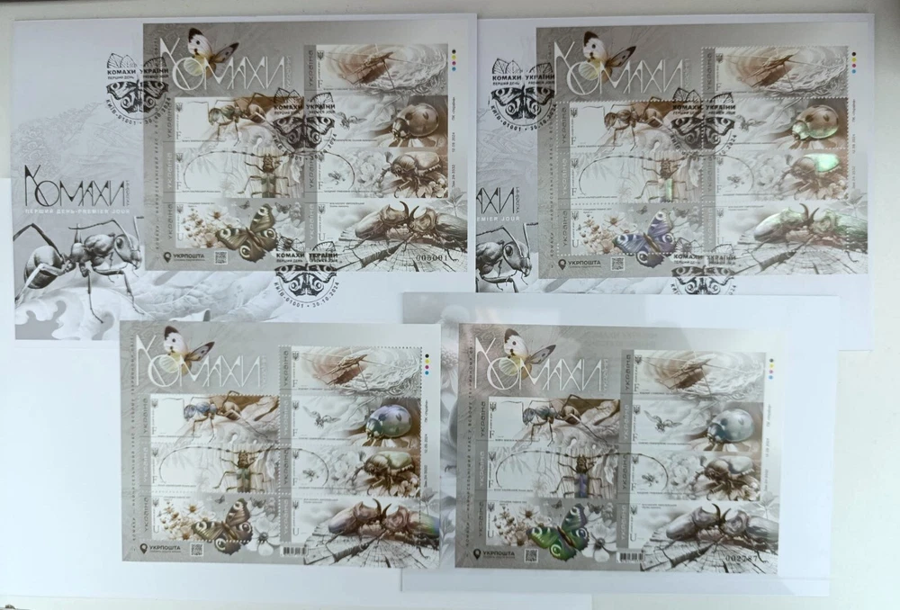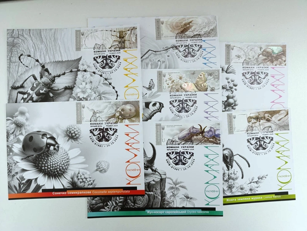 📬 "Exclusive"set! «Insects of Ukraine» 2024 Set 11 in 1 with NON-PERF0RATED blocks! Exclusive from Ukrposhta "Insects of Ukraine" The set of postal products for October 2024 includes the issue 🐞 "Insects of Ukraine": ✔️ 1pcs Stamp sheet with 7 stamps with holographic film elements ✔️ 1pcs C5 envelope with stamp sheet with repayment "First day. Kyiv" ✔️ 1pcs Stamp sheet numbered non-perforated with 7 stamps with holographic film elements in a booklet ✔️ 1pcs C5 envelope with a numbered non-perforated stamped sheet with repayment "First day. Kyiv" ✔️ A set of 7 maximum cards with repayment "First day. Kyiv" This issue is a continuation of the legendary “Insects of Ukraine” sheet of stamps issued in 2018, which has won the largest number of awards in the history of philately in modern Ukraine: Grand Prix of the WIPA International Philatelic Exhibition in Vienna (Austria), Grand Prix of the Asiago Philatelic Art Prize (Italy) and the second prize Nexofil to Best Stamp of the World (Spain). On the stamp sheet a modern technology of holographic film embossing was used for the first time. The 2024 postal issue features: yellow meadow ant Lasius flavus, Rosalia longicorn Rosalia alpina, European peacock butterfly Aglais io, common pond skater Gerris lacustris, seven-spot ladybird Coccinella septempunctata, common cockchafer Melolontha melolontha, European rhinoceros beetle Oryctes nasicornis. Specification: Artist — Serhii ta Oleksandr Kharuky Isuue date (year) — 30.10.2024 The number of stamps in the sheet — 7 Face value of each postage stamp — 2хU+5xF The cancellation will not take place in the city of Odessa! Shipping within 1-3 days, to the USA and Canada 14-30 days, European countries 10-25 days, Israel 30-35 days. Please take your country's holidays into account. 💙💛