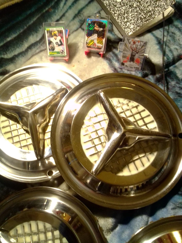 The product is a set of four vintage 14" Olds Fiesta Style hubcaps with a crossbar design in chrome finish. These hubcaps are suitable for rear, left, front, and right placements on vehicles with 14" wheels. They are interchangeable with various models such as Dodge, Plymouth, Ford, Chevy, Mercury, Buick, and Oldsmobile. The manufacturer offers a 6-month warranty on these chrome hubcaps.