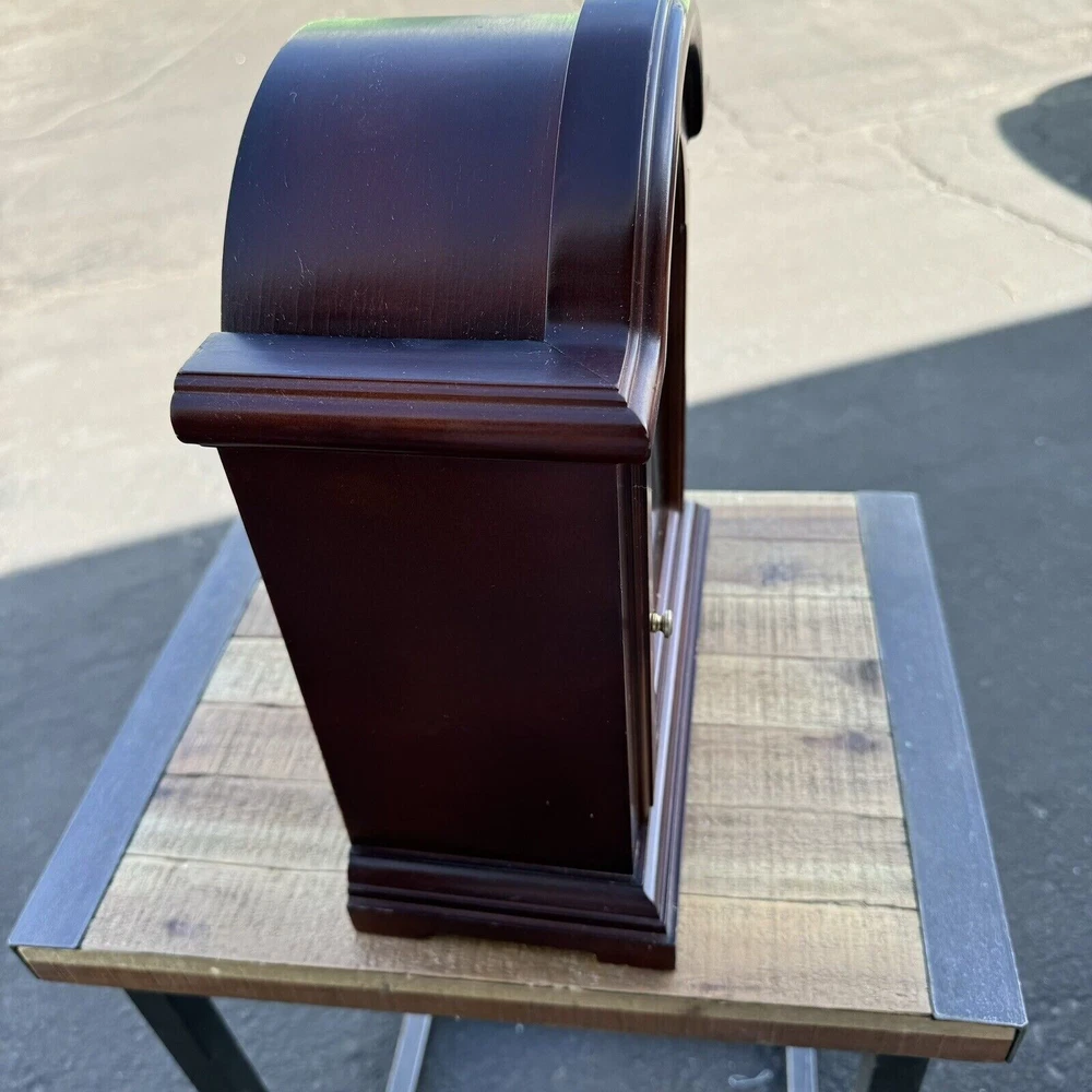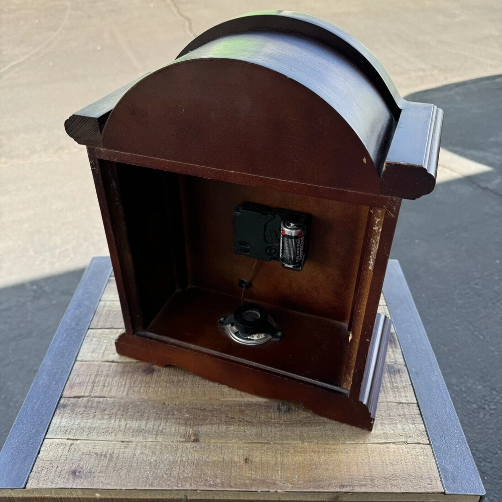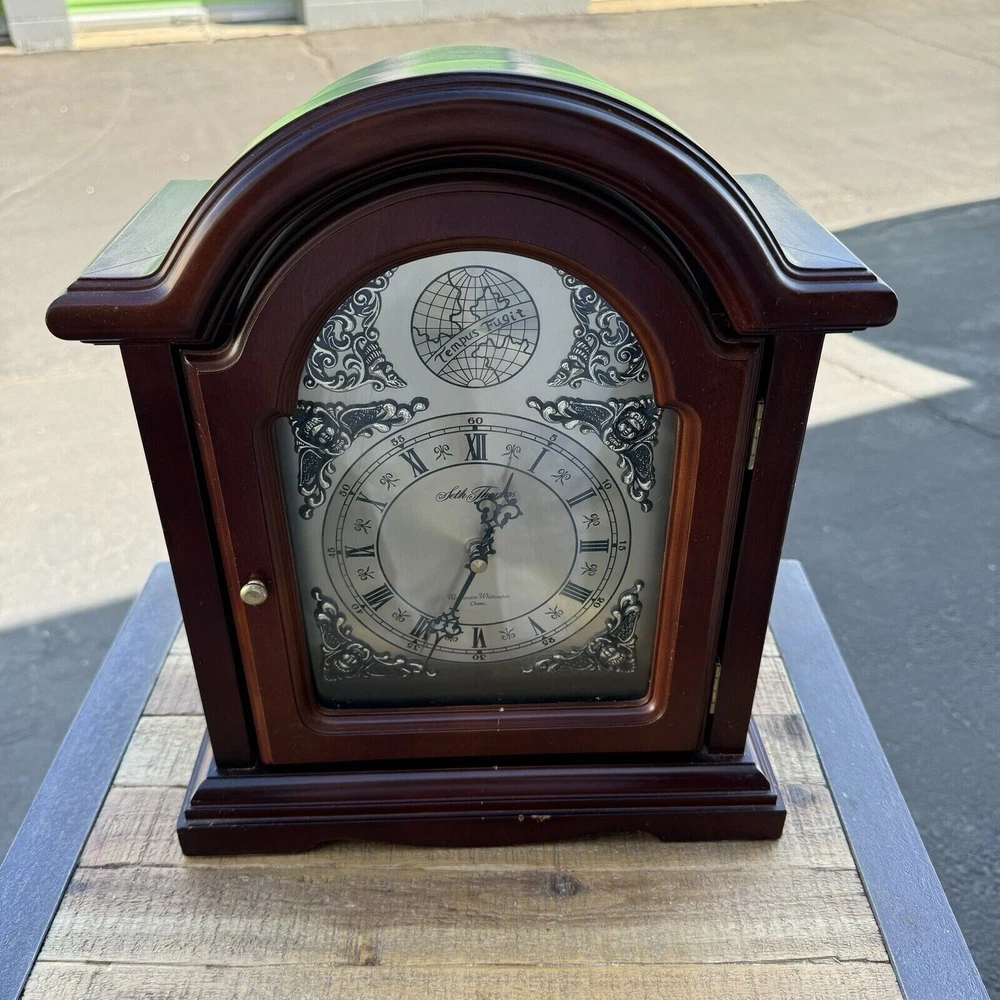 This Seth Thomas Mantle Clock features a brown wooden frame with a chime door and "Tempus Fugit" inscription. It is a quartz (battery powered) clock from the 2000-2009 time period. The clock is designed for desk or shelf display, and it has been tested and confirmed to be in working condition. Shipped with USPS Ground Advantage.