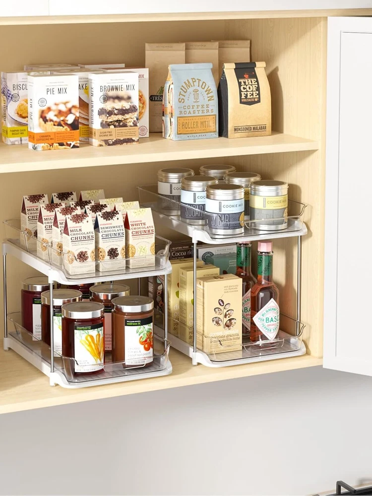 Delamu 2 Sets of 2-Tier Multi-Purpose Bathroom Under Sink Organizers and Storage, Stackable Kitchen Pantry Organization, Pull Out Medicine Cabinet Organizer with 8 Movable Dividers Item Description About this item Acrylic Available in 2 Different Sizes: The smaller size (S) measures 8.27" x 13.19" x 9.06", and the larger size (L) measures 8.27" x 13.19" x 10.63". High-Low combos make this bathroom organizer versatile for multi-purpose storage and organization, such as kitchen organization, cabinet organizer and storage, bathroom organizer countertop, pantry organizer, under sink organizer, etc. Pull-Out Drawers and Divider: This kitchen organization and storage set come with 4 slide-out drawers and 8 movable dividers. Each drawer can slide in and out smoothly, making it a breeze to access hard-to-reach things. The movable divider allows you to freely adjust the spacing as you like to organize your meds, cosmetics, stationery, skincare, perfume, brushes, etc. Upgraded Clear Acrylic Organizers: The kitchen cabinet organizer are Selected with high-end acrylic, aluminum alloy support rod, etc high-quality materials to Produce, so you can see the inside clearly and find the wanted stuff fast, An essential assistant for bathroom organization, and kitchen organizer and pantry storage, keeping toiletries and kitchen seasoning organized. Stackable Pantry Storage Organizer: What sets this pull out cabinet organizer apart is that you can stack 3 at a time according to space needs, which means it is a must-have space saver! it is very useful for organizing to hold spice jars, medicines bottles, beverages, canned goods, grab-and-go snacks, and even a variety of health/beauty aides, and small items. Anti-slip Durable and Convenient: We provide non-slip silicone stoppers at every base to prevent the bathroom countertop organizer from moving around, even when pulling out a drawer. The 8 support rods are made of rust-proof and durable aluminum alloy for long-lasting use. Assembly is easy - simply connect the bottom base and upper drawers with the 4 rods. › See more product details *This is Great for Bathroom Organization! “This storage solution has truly upgraded my bathroom experience! It has completely transformed my space into an organized sanctuary, saying goodbye to all the clutter. Highly recommend it to anyone looking to elevate their bathroom organization!” - John Smith *Great Pantry Organization and Storage “I do like the Delamu pantry organization solution! It’s a game-changer for keeping my pantry organized and saving space. Highly recommend!” - Emily Taylor *Nice Storage Shelf for Baby Organizer! “Love this storage shelf for organizing my baby’s essentials! Makes life so much easier as a new mom. Highly recommend this shelf to all new moms out there!” - Daniel Evans *2 Sets of Storage for Under Sink Cabinet “I can’t believe how much this storage shelf has transformed my cluttered bathroom! It’s such a clever solution for utilizing the space below the drain. I highly recommend this storage shelf to anyone looking to declutter and organize their bathroom!” - Sarah Anderson *Its stackable design maximizes space with up to three tiers. Made from clear acrylic and ABS plastic, the shelf are stylish, easy to clean, and feature adjustable dividers for all storage needs in compact areas. *Absolutely! It's versatile enough to hold beauty products, toiletries, medications, cleaning supplies. Its design is perfect for organizing items in compact spaces, including under bathroom and kitchen sinks, over / under bathroom vanities, cabinets. *To ensure stability and prevent items from falling, place heavier items towards the back of the drawers. Since there are no tracks, remove items gently to keep balance. For taller items, consider placing them on the upper drawer. “This storage solution has truly upgraded my bathroom experience! It has completely transformed my space into an organized sanctuary, saying goodbye to all the clutter. Highly recommend it to anyone looking to elevate their bathroom organization!” - John Smith “I do like the Delamu pantry organization solution! It’s a game-changer for keeping my pantry organized and saving space. Highly recommend!” - Emily Taylor “Love this storage shelf for organizing my baby’s essentials! Makes life so much easier as a new mom. Highly recommend this shelf to all new moms out there!” - Daniel Evans “I can’t believe how much this storage shelf has transformed my cluttered bathroom! It’s such a clever solution for utilizing the space below the drain. I highly recommend this storage shelf to anyone looking to declutter and organize their bathroom!” - Sarah Anderson Payment Shipping . Return