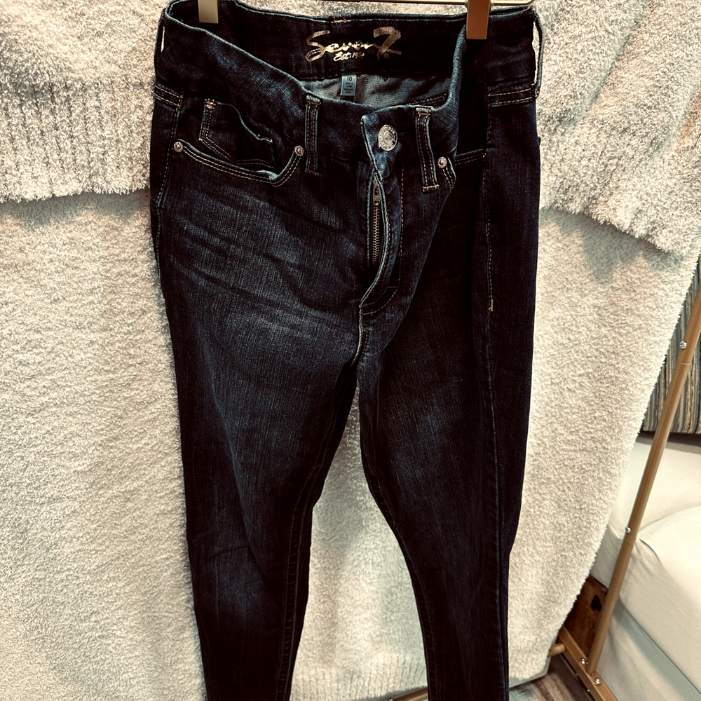 The Seven7 Tummyless Skinny Jeans are high-rise women's jeans in a size 10, made from a denim fabric with a medium wash. These jeans feature a 5-pocket design, a slimming and shaping fit, and offer comfort and stretch for easy wear. The closure options include a zip and button, with accents like buttons and a logo. The tummyless design and skinny fit make them flattering and stylish, perfect for all seasons and versatile styling options.