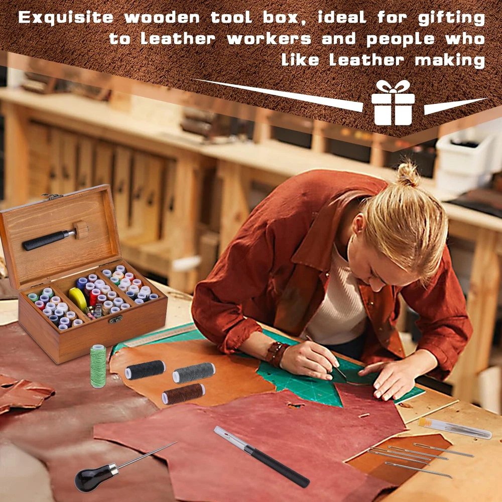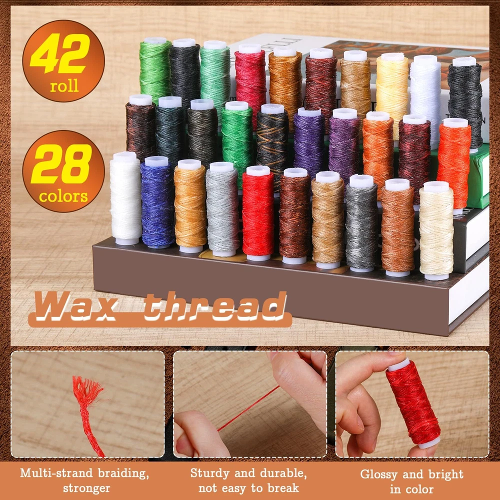 Abundant Upholstery Repair Kit - This leather sewing kit includes: 42 x leather waxed thread, 23 x leather sewing needles, 6 x curved needles, yarn scissors, thread ripper, 4 x sewing clips, awl, sewing thimble, measuring tape, all the necessary essentials for your sewing needs. Abundant Upholstery Repair Kit - This leather sewing kit includes: 42 x leather waxed thread, 23 x leather sewing needles, 6 x curved needles, yarn scissors, thread ripper, 4 x sewing clips, awl, sewing thimble, measuring tape, all the necessary essentials for your sewing needs. HAND SEWING THREAD - 13 yards (12m) of waxed leather thread, lightweight, portable, strong, and durable to use. We have more wax threads in basic colors and commonly used colors. The 28 colors are divided into 42 rolls, with more color options to meet different applicable scenarios. LEATHER STITCHING NEEDLES - Leather sewing needle manual paper art sewing needle suits Include triangle pointed needle, the tip needle, curved needle, etc. The leather stitching needles are made of quality materials, strong and tough. WIDELY USED - Perfect leather repair sew kit for carpets, upholstery, coats, tents, and mattresses. Practical and abundant leather DIY tools kit, you can sew different leather, fabric, denim, canvas, tarpaulin, or other projects. This is an essential tool for leather professionals and beginners. ELABORATELY CRAFTED - As craft professionals, we are well aware of what craft enthusiasts expect from the quality of their tools, so we have always emphasized the high demands on quality. This hand-stitched set can be used for a long time. Please choose with confidence.