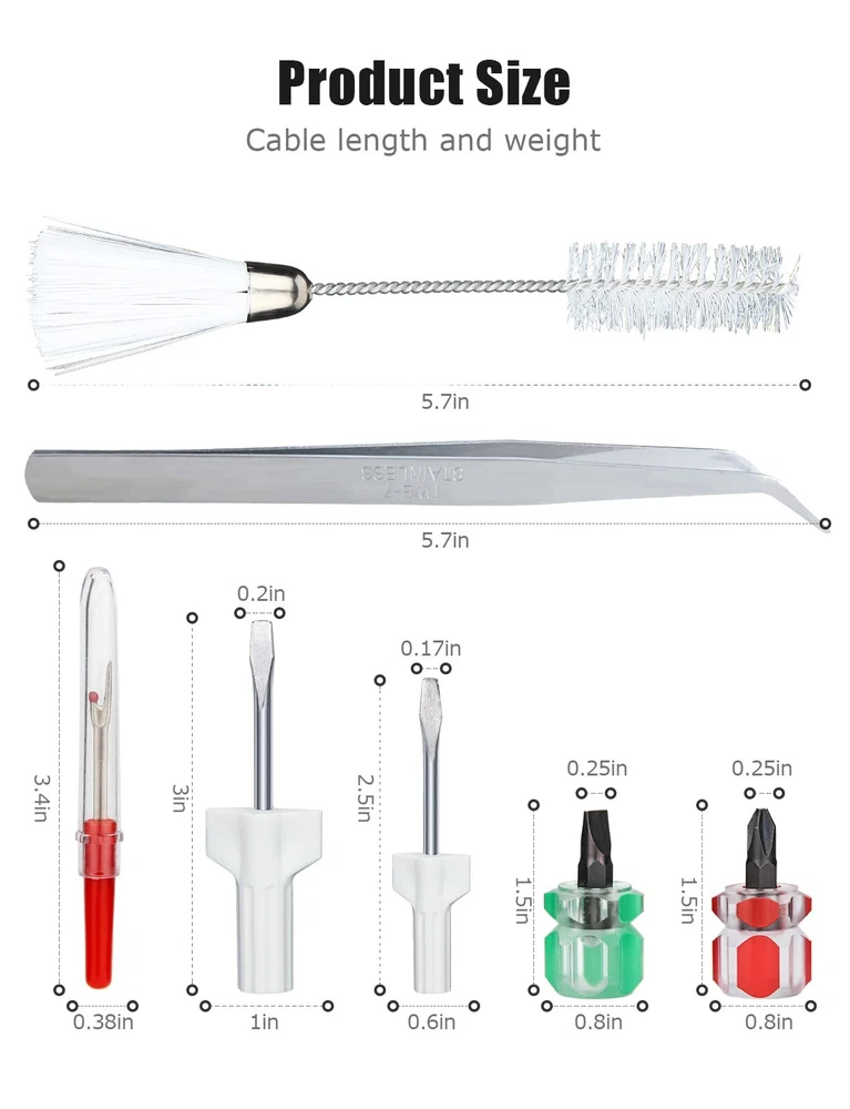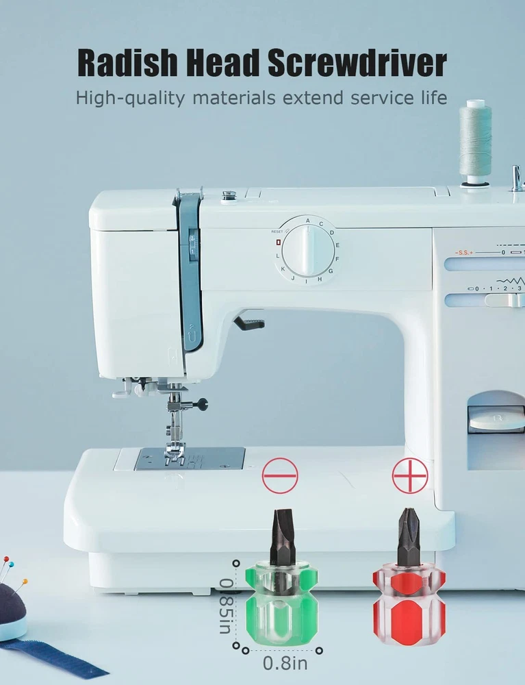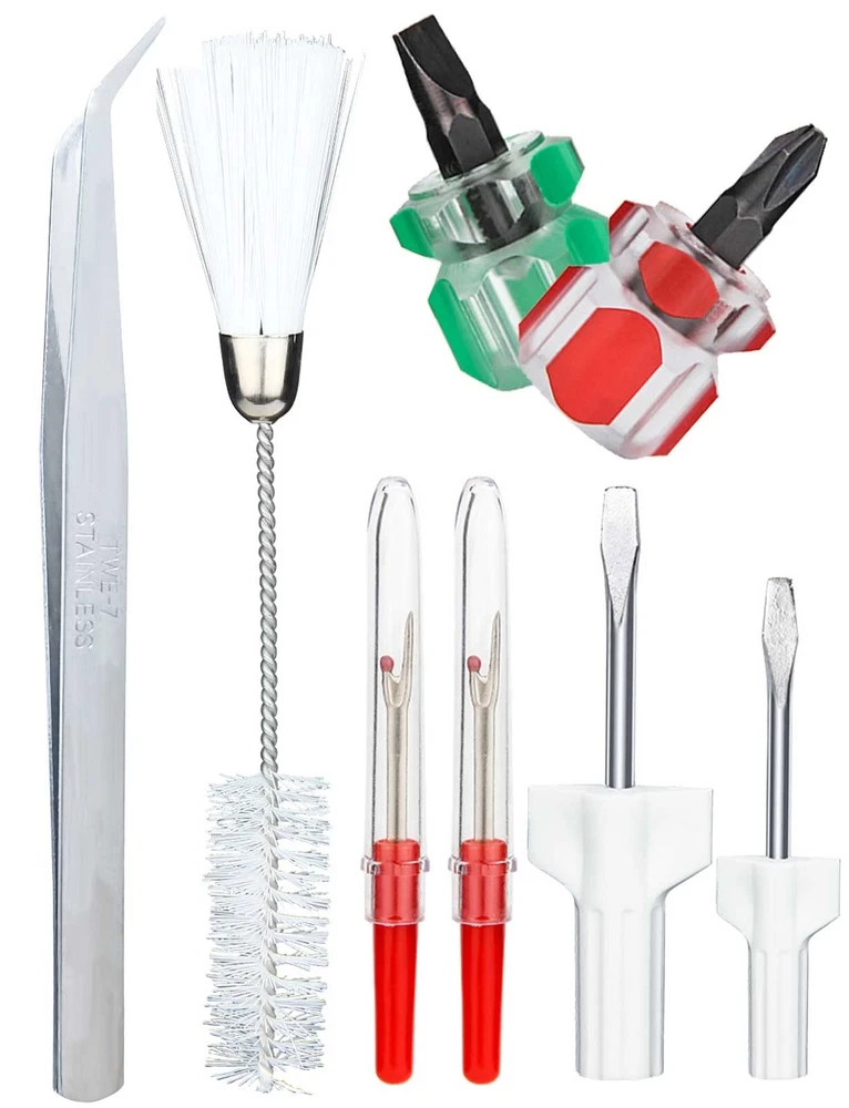 Package Contains: 1 pack tweezer, 1 pack double headed lint brush, 2 pack red seam ripper with plastic handles, 2 pack ultra short screwdrivers (one flat head and one phillips) and 2 pack different size screwdrivers (one small and one large). Ideal for replacing lost or dull original tools in your sewing box, easy to repair and cleaning sewing machines. Package Contains: 1 pack tweezer, 1 pack double headed lint brush, 2 pack red seam ripper with plastic handles, 2 pack ultra short screwdrivers (one flat head and one phillips) and 2 pack different size screwdrivers (one small and one large). Ideal for replacing lost or dull original tools in your sewing box, easy to repair and cleaning sewing machines. Sewing Ripper with Cover: The handle and housing are plastic, and the ripper is metal, which is hard and durable and not easy to break. The prongs are very sharp for easy stitch removal. Each has its own plastic cover, which you can cover when not in use to prevent yourself from hurting yourself, and can be added to the rear to extend the handle when in use. The red looks stand out, making it easy to find it in your sewing box. Four Different Sizes of Screwdrivers: 2 brightly colored ultra-short screwdrivers, green flat head screwdriver and red Phillips head screwdriver for easy distinction. The 6 easy-to-grip grooves on the short handle end allow your fingers to rotate in tight spaces. Made of plastic handle and bearing steel. Two other screwdrivers of different sizes are made of plastic handle and carbon steel, it is useful for bobbin case tension adjustment. Durable and can be used for a long time. Curved Tweezer: TWE-7 stainless steel tweezers are durable and have a smooth handle for easy grip. The small, curved tip makes it easier to reach tight areas and remove stubborn wires that are stuck or blocking the machine. Tweezers can also be used to move the fabric around the sewing needle and hold the fabric in place for threading to prevent putting your fingers in dangerous places. The tip is slightly rounded instead of pointed, so don't worry about hurting yourself. Double Ended Sewing Machine Brush: Double ended different hardness bristles are much easier to clean the hard reach place. It is ideal for cleaning of cotton velvets on the shuttle to keep your sewing machine clean. Made of nylon and stainless steel, it is durable and the bristles are not easy to fall off.