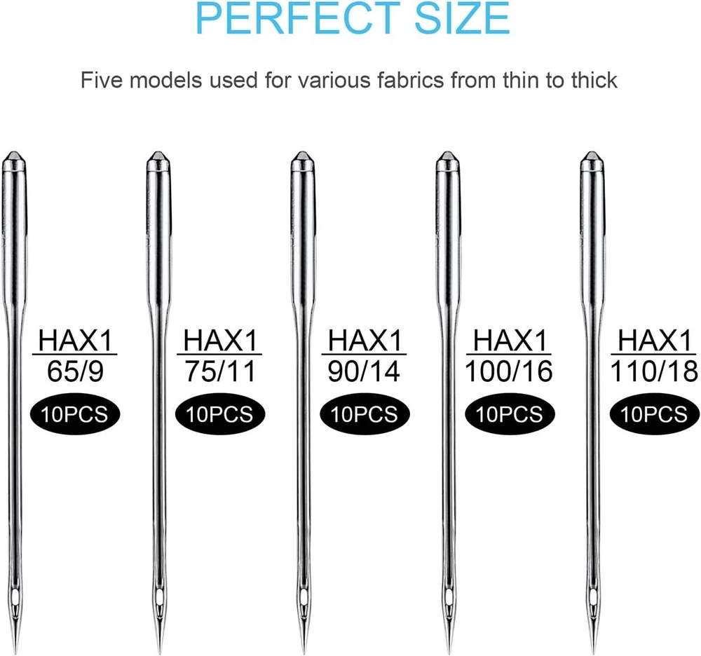 Sewing Machine Needles, 20 PCS Universal Sewing Machine Needle, Compatible with Singer, Brother, Janome, Varmax, Size HAX1 75/11, 90/14 Product Details Product Dimensions: 2.83 x 2.05 x 0.63 inches Item model number: HAX1 Item Weight: 1.76 ounces Manufacturer: KIDOOM Country of Origin: China Brand: kidoom Compatible Devices: Domestic Sewing Machine Point Type: Regular Point PREMIUM QUALITY MATERIAL: Made of top quality high-strength steel, sharp smooth, sturdy and durable, not easy to bend, and long service life. VALUE PACK & PERFECT SIZE:This set come with two sizes: 75/11, 90/14, 10 needles per size, total 20 needles. Also includes 2 storage tubes (free) and 3 bobbins (free). PERFECT COMPATIBILITY: They are compatible with most household sewing machines or old sewing machines, such as Singer, Brother, Janome, Varmax, etc. Notice! Not suitable for industrial large sewing machines. ENJOY THE FUN OF DIY: More Perfect for medium-thin fabrics such as shirts, satin (size: 75/11), ordinary fabrics such as windbreakers(size: 90/14). INTIMATE GIFT: The set is an amazing gift for your relatives, friends, families, mother and wife. Are you looking for different sizes sewing machine needles to match your sewing machine?We can solve your problem!We make a wide selection of small, medium-sized, large sewing machine needles set, ideal for almost all your purposes.These sewing machine needles are ideal for quilting, sewing, home decor projects, embroidery, and craft set come with the most commonly used model: 100/16 (20 needles). Also includes 1 storage tube (free) and 3 bobbins(free).You can never have too many sewing machine needles. And with these, you won’t need any more for a long set fits most!No more hesitation! Try it now!Product Specification:Material: Top quality high strength steelSize: 1.54 inColor: SilverPackage Includes: 20* HAX1 100/16: suitable for thick fabrics(such as jeans fabric)1 storage tube (free)3 bobbins (free)