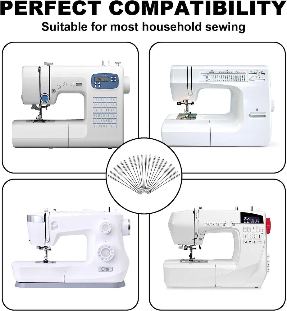 CONTACT US DIRECTLY FOR FREE & PREPAID RETURNS Sewing Machine Needles, Universal Sewing Machine Needle, for Singer, Brother, Ja 【Perfect Compatibility】 They are compatible with most household sewing machines or old sewing machines, such as Singer, Brother, Janome, Varmax, Kenmore, etc. NOTICE! Not suitable for industrial large sewing machines. 【Value Pack Set】 This set comes in five sizes: 65/9, 75/11, 90/14, 100/16, 110/18, 10 needles per size, 50 needles in total. It also includes 3 bobbins, 5 storage tubes (random color) and 1 transparent box for storage. 【High Quality Material】This machine needles are made of top quality high-strength steel, high hardness, sharp needle tip, smooth needle hole, not easy to bend & skip needle, and long service life. 【Suitable Multiple Fabrics】Suitable for thin fabrics such as tulle, silk (size: 65/9); medium-thin fabrics such as shirts, satin (size: 75/11); ordinary fabrics such as windbreaker (size: 90/14); thick fabrics such as jeans(size: 100/16); thicker fabrics such as thick coats(size: 110/18) . 【Perfect Gift 】The set is a perfect gift for your relatives, friends, families, mother and wife, whether they are professionals or beginners, they will find this kit convenient and complete, especially for DIY hand stitch lovers. 【Quality Assurance】 100% Money Back Guarantee. We provide high quality sewing machine needles, if you have any questions, please feel free to contact us through Amazon. Are you looking for a high-qualityhousehold sewing machine needle? Our sewing machine needles are compatiblewith most household sewing machines or old sewing machines, such as Singer,Brother, Janome, Varmax, Kenmore, etc. they are ideal for quilting, sewing,home decor projects. Whether you are professionals or beginners,you will find this kit convenient and complete, especially for DIY hand stitchlovers. The set is also a perfect gift for yourrelatives, friends, families, mother and wife. Product Specification: Material: Top quality high strength steel Needle Size: 1.54 in Color: Silver Package Includes: 10* HAX1 65/9: suitable for thin fabrics(such as real silk fabrics) 10* HAX1 75/11: suitable for medium andthin fabrics (such as shirt fabrics) 10* HAX1 90/14: suitable for medium andthick fabrics (such as windbreaker and jacket fabrics) 10* HAX1 100/16: suitable for thick fabrics(such as jeans fabric) 10* HAX1 110/18: suitable for thickerfabrics (such as thick cotton fabrics) 5 storage tubes 3 bobbins 1 transparent box for storage Lifetime Guarantee: 100% Money back guarantee. We providehigh-quality sewing machine needles, if you have any problems with it, pleasefeel free to contact us via Amazon. REVIEWS The product came very well packaged. I'm very happy. thank you for everything. Seller strongly recommended. This is great! I definitely recommend! Product looks amazing Delivery was fast. Excellent seller, great communication. I advise everyone